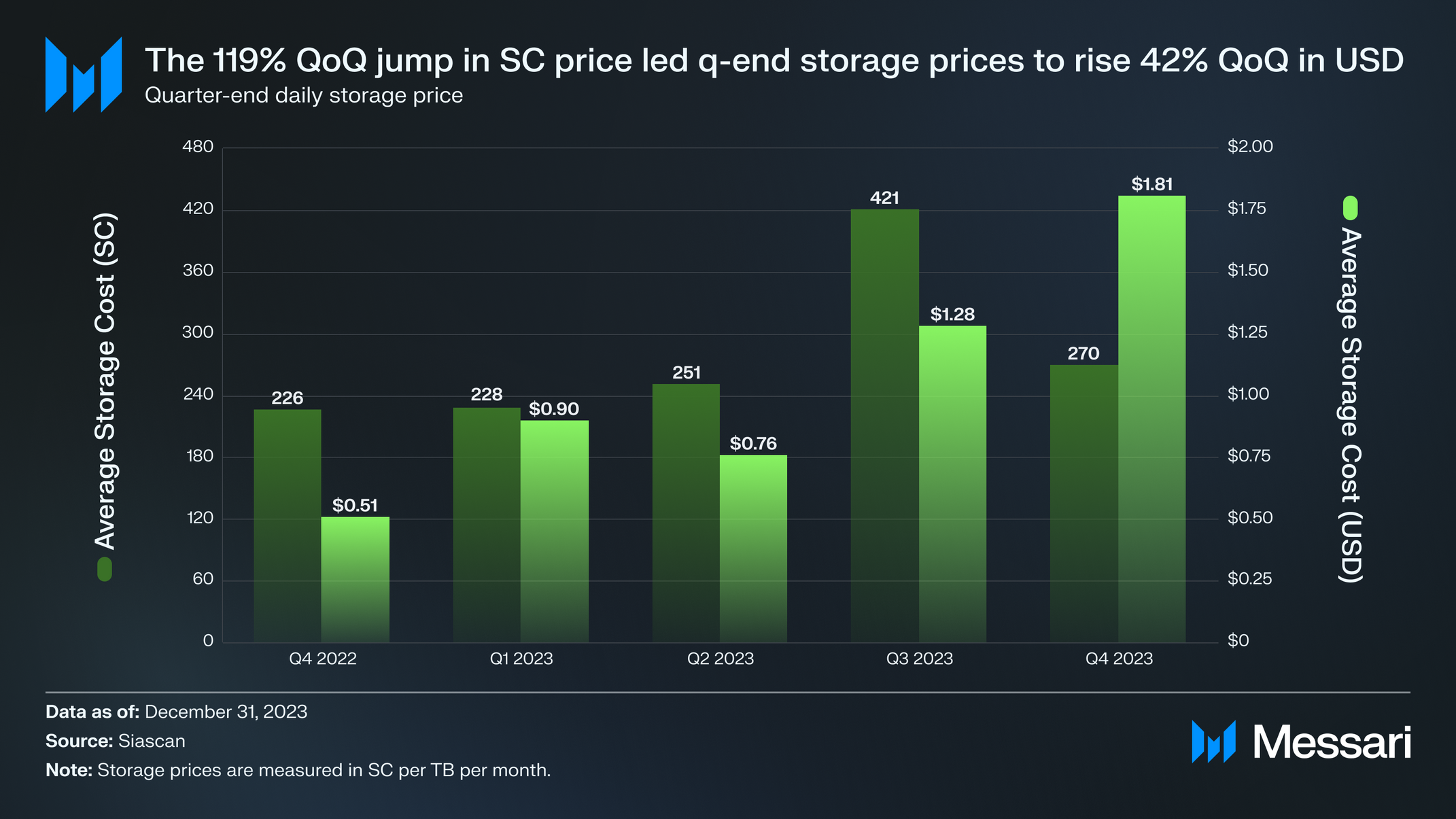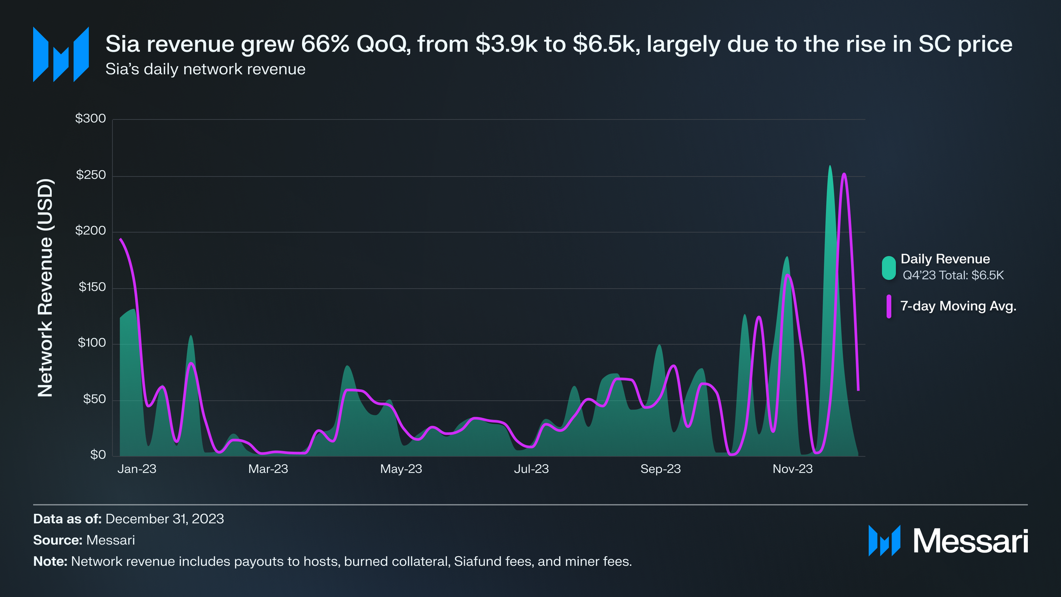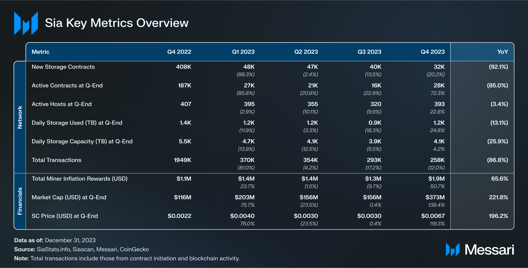 Sia had a productive Q4 experiencing QoQ growth in several key metrics, including used storage (+25%), active contracts (+72%), active hosts (23%), storage capacity (4%), SC price (+119%), and market cap (+138%). Despite a rise in the USD prices for storage and bandwidth costs, Sia ended Q4 with more data stored than in the previous quarter. And to end the year, it released the official versions of its renting (renterd) and hosting (hostd) interfaces — both of which make interacting with the network more seamless for renters and hosts. If the market continues in a bullish direction, Sia’s position as the longest-operating storage network in crypto may appeal to developers seeking to prioritize privacy and quick data retrieval.