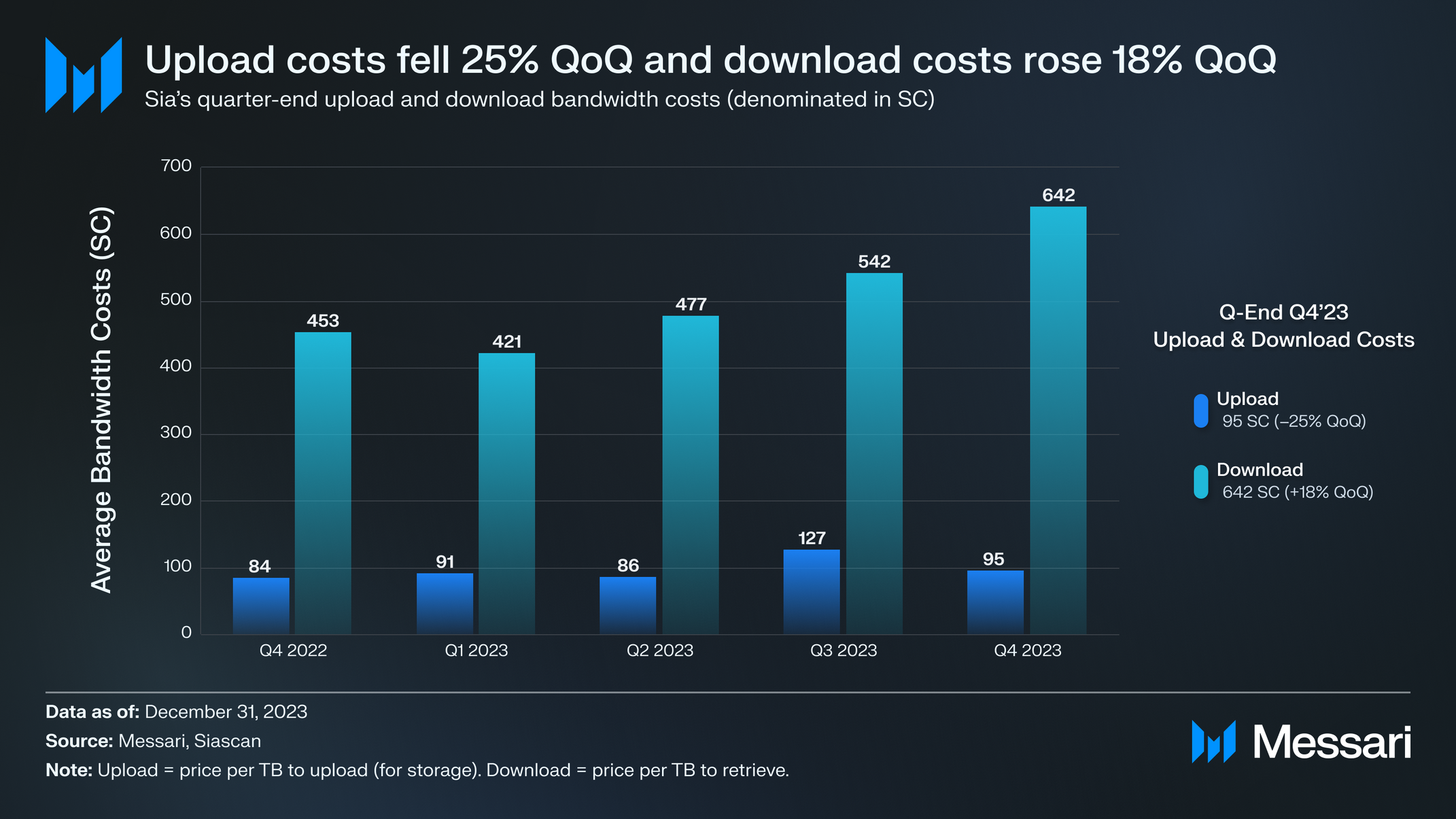 Bandwidth costs denominated in SC moved in opposite directions during Q4: upload costs decreased by 25% QoQ, and download costs increased by 18% QoQ. Falling upload costs result in cheaper storage contracts for renters already holding SC. Hence, the increase in storage utilization may be a result of activity from renters already holding SC. For these renters, the fall in costs denominated in SC would make storage less expensive despite a rise in USD value.