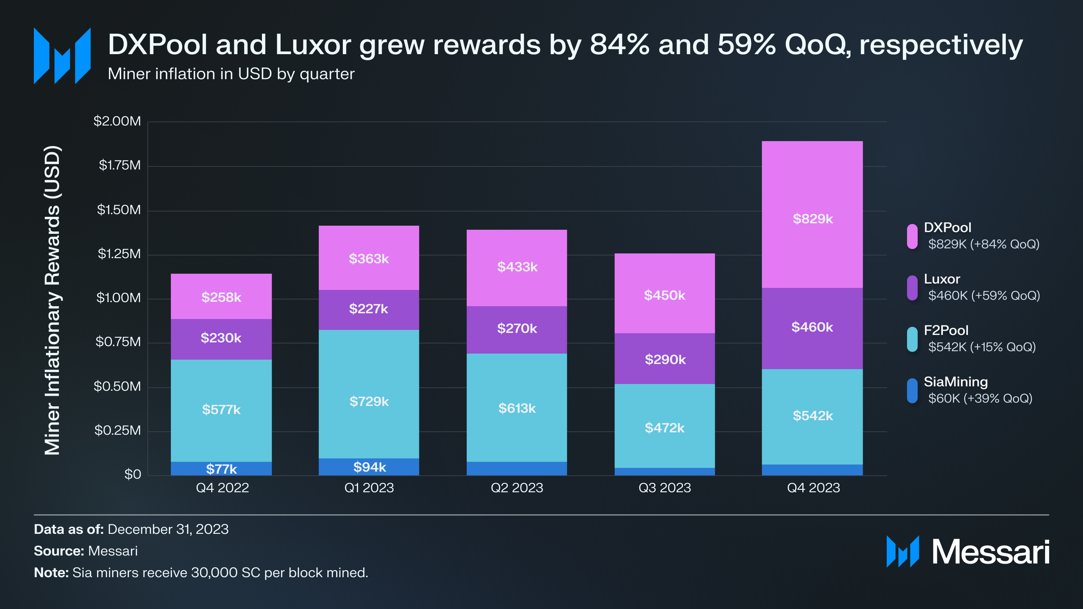 All Sia miners experienced QoQ increases in inflationary block rewards in USD. In Q4, DXPool and Luxor saw the most growth in rewards, increasing by 84% and 59%, respectively. Because rewards are proportional to work performed on the network, DXPool clearly outworked other miners, earning 53% more than the next-highest earning miner (F2Pool).