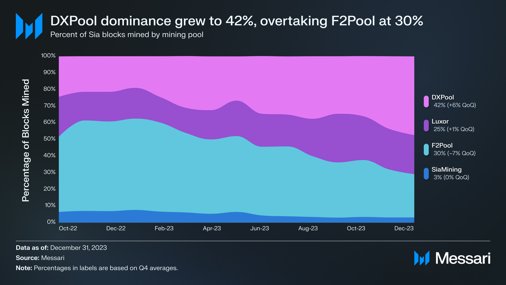 - The distribution of blocks mined among Sia’s four mining pools became more decentralized throughout the year, with F2Pool’s market share dropping from 51% in Q4’22 to 30% in Q4’23.