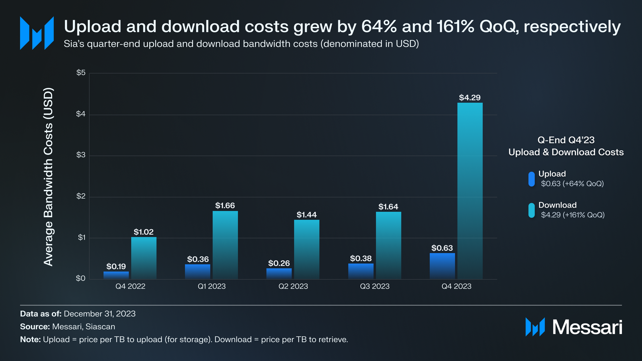 Upload and download bandwidth costs denominated in USD increased by 64% and 161%, respectively. This growth in the USD value of costs can be attributed to SC’s 119% QoQ price increase. Despite bandwidth prices and storage prices increasing in dollar terms, Sia still grew used storage by 25% QoQ, which may be indicative of renters already holding SC before the Q4 price jump.