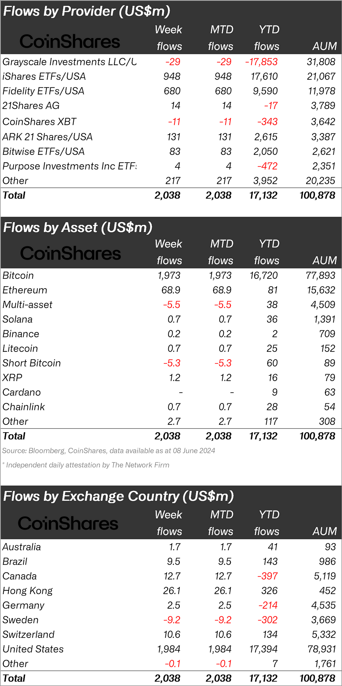 - Bitcoin was again the primary focus, seeing US$1.97bn inflows for the week.