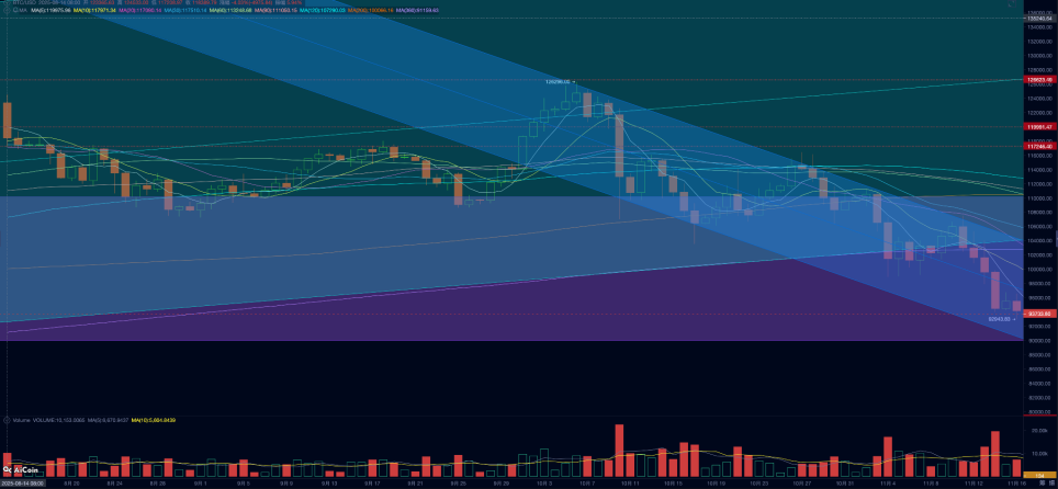 BTC price falls below the lower edge of the upward channel of this bull market.