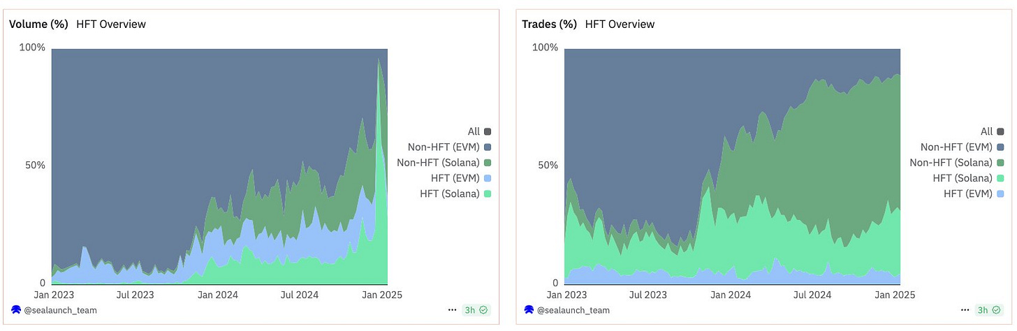 HFT activity has grown significantly across both EVM chains and Solana. For months, it has accounted for around 20% of DEX volume across all chains (split between Solana and EVM chains). But recently, Solana has taken the lead. Most of the HFT-driven volume now happens there. In terms of trades, HFT activity on Solana represents 30% of trades across all DEXs in all chains and EVM chains represent 6%.