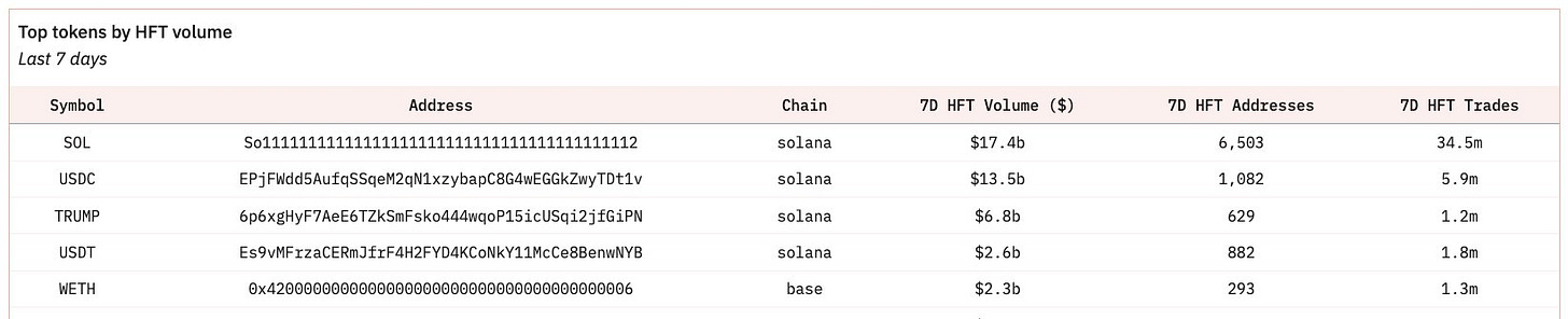 In the last 7 days, the top 4 assets by HFT volume (SOL, USDC, TRUMP, USDT) are all on Solana. For example, TRUMP recorded $7B in volume from 629 HFT addresses. As noted earlier, $4B of this volume came from a single address. An exception is WETH on Base, which had $2.3B in volume driven by 293 HFT addresses over the same period.