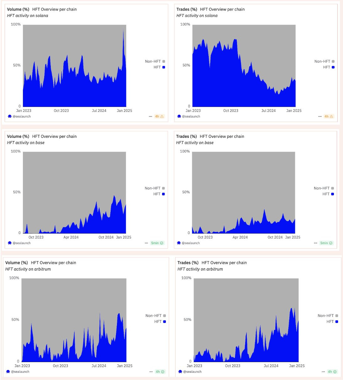 Benchmarking 4 chains with significant DEX activity (Solana, Ethereum, Base, and Arbitrum), we see a clear trend:- HFT activity is growing across all chains, impacting both volume and trades.- The chain where HFT addresses represent more of the total volume is Solana, now accounting for ~50% of total volume, and in some weeks close to 70%.- On Base and Arbitrum, HFT’s impact is also increasing. HFT addresses represent ~35% of volume of these chains.- On Ethereum, HFT accounts for 15% of volume, as expected, Ethereum’s lower throughput and higher transaction costs act as barriers, limiting the scale of HFT compared to other chains.