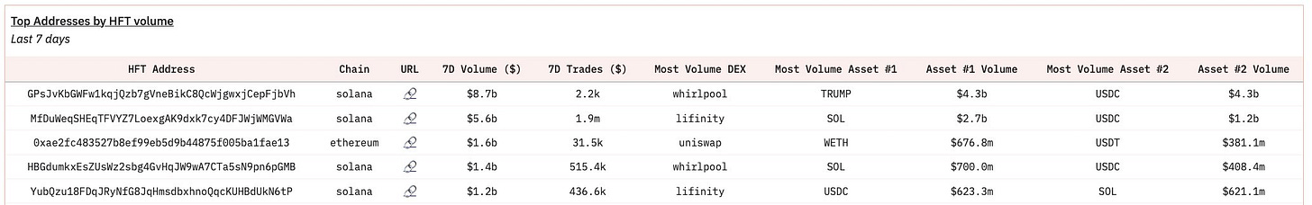 Analyzing the last 7 days, 8 of the top 10 HFT addresses by volume are on Solana. One example is GPsJvKbGWFw1kqjQzb7gVneBikC8QcWjgwxjCepFjbVh, which executed $8B in volume from 2,000 trades. Half of this volume ($4B) came from trading TRUMP.