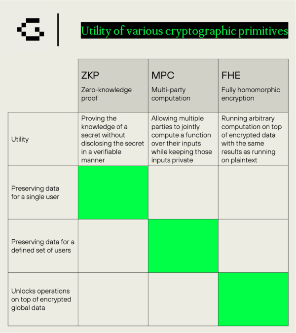 In this context, utility refers to the extent to which a broad user base can simultaneously enjoy privacy. The greater the number of users who can share privacy at the same time, the higher the system’s utility. This concept is crucial because it highlights one of the core distinctions between different underlying cryptographic primitives such as Zero-knowledge proof (ZKP), Fully homomorphic encryption (FHE) and Multi-party computation (MPC):_ZKP: prove the knowledge of a secret without disclosing the secret in a verifiable manner_FHE: enable arbitrary computation on top of encrypted data; having the same result as running on plaintext_MPC: allow multiple parties to jointly compute a function over their inputs while keeping those inputs private.