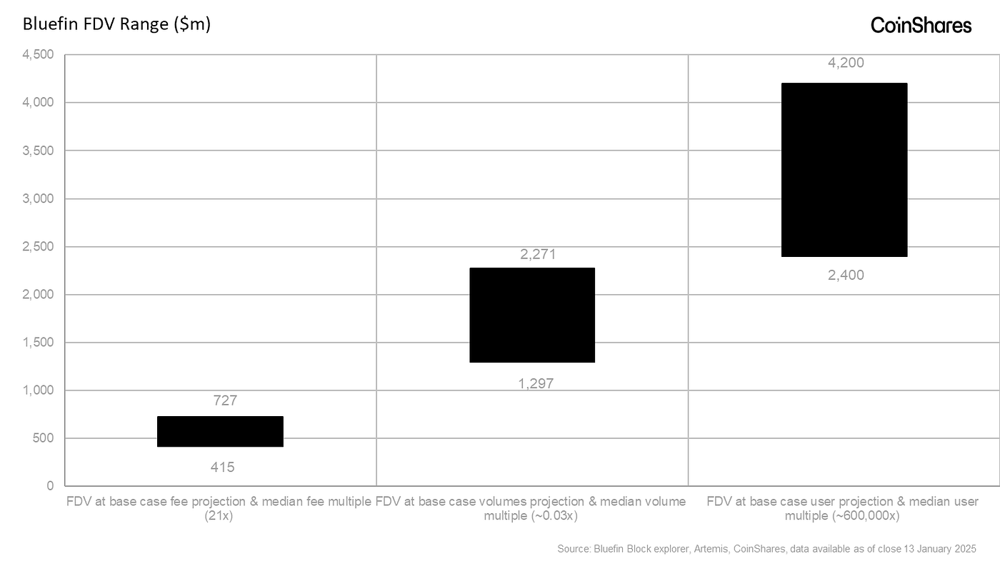 Bluefin is a Perpetual Futures DEX, and one that we think is currently underpriced with >2x upside on fee multiples; >4x upside with volume multiples ; >8x upside with user multiples.