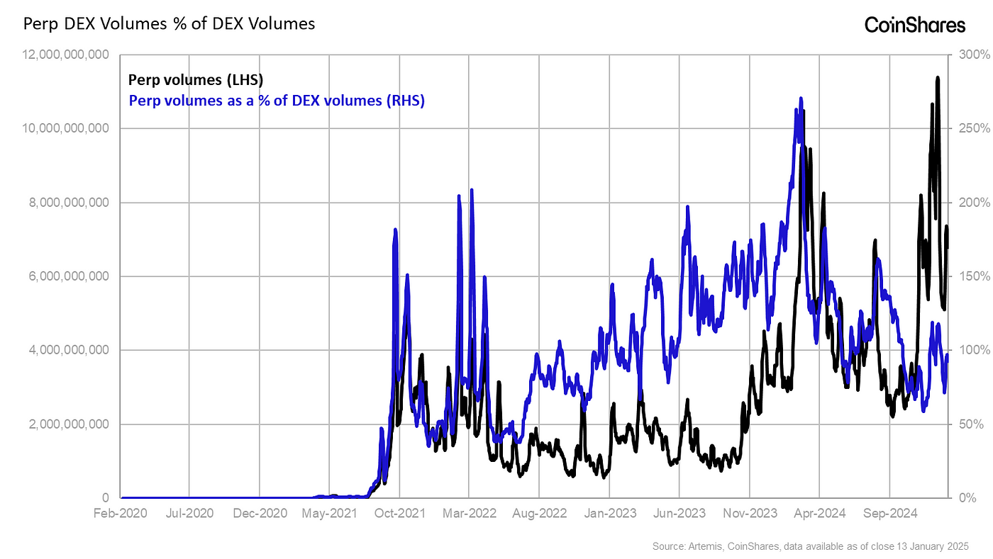 The landscape of decentralised derivatives trading has diversified. For example, Peer-to-Pool models include GMX, off-chain order book models like dYdX, virtual AMMs such as Perpetual Protocol, and hybrids like Drift, which combine AMMs and order books. In 2024, perpetual DEXs showed a skewed distribution of success, with total volumes growing 210% year-over-year across platforms. Median growth was 208%, while the mean was 1,184%, driven by standout performers like Solana-based Jupiter and Drift, which saw volume increases of 5,176% and 628%, respectively. These gains were largely fueled by meme-coin trading and prediction markets, particularly in the run up to the U.S. election.
