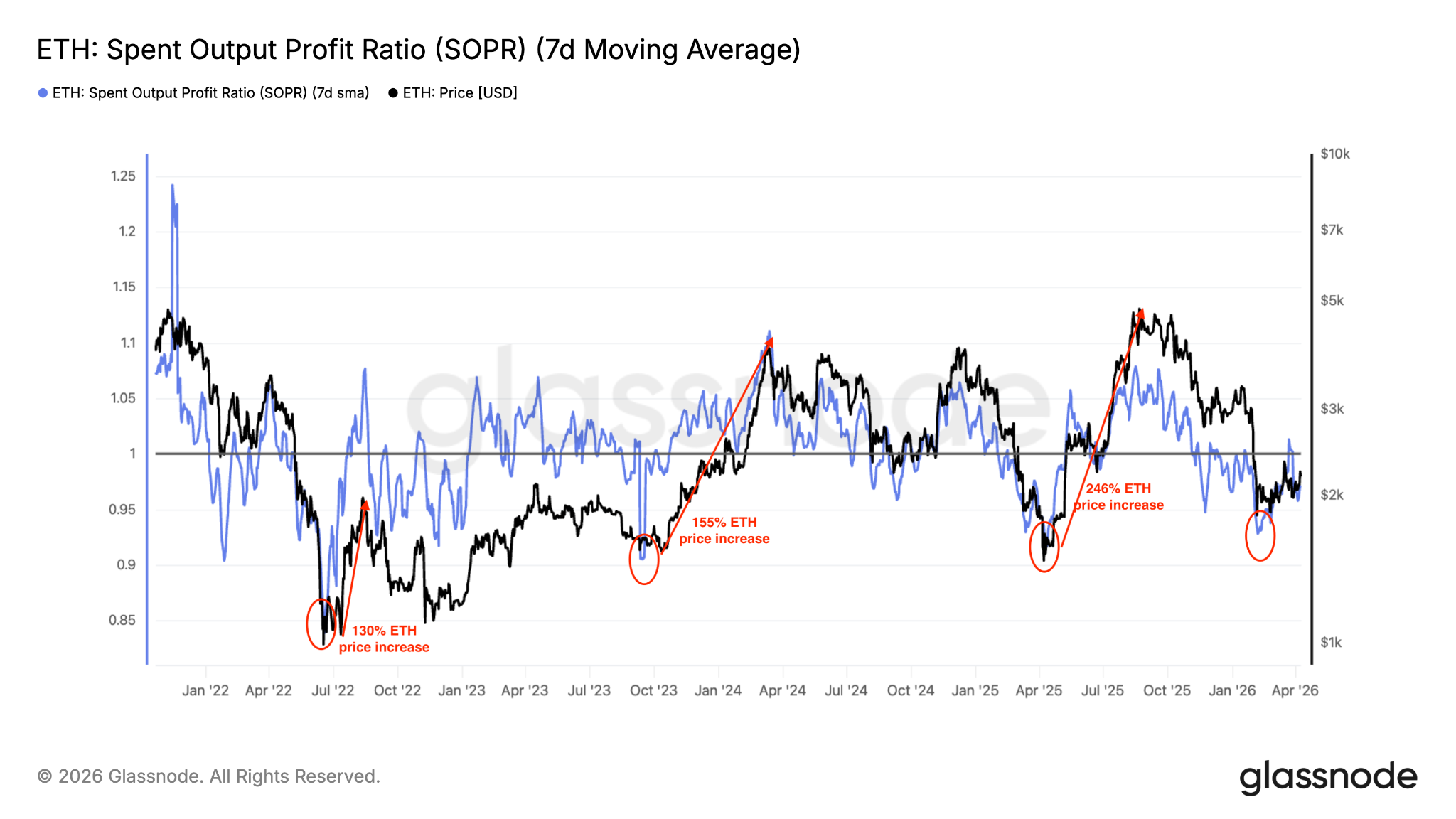 SOPR measures the profit or loss of spent ETH outputs by comparing the value of coins when they were last moved to their value when they are spent again.
