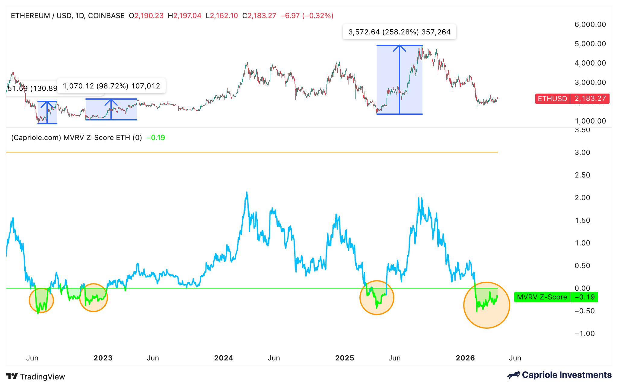 The last time Ether’s MVRV Z-score fell to the current levels was in April 2025, after a 66% price drawdown. This coincided with a macro market bottom at $1,400 and preceded a multi-month rally, with the ETH/USD pair rising 258% to its current all-time high of $4,950.