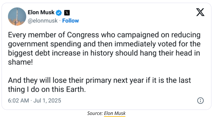 The Tesla boss has taken issue with the government spending allowance in the bill, which is estimated to add $3.3 trillion to the national debt over the next 10 years, having called it a “disgusting abomination.”