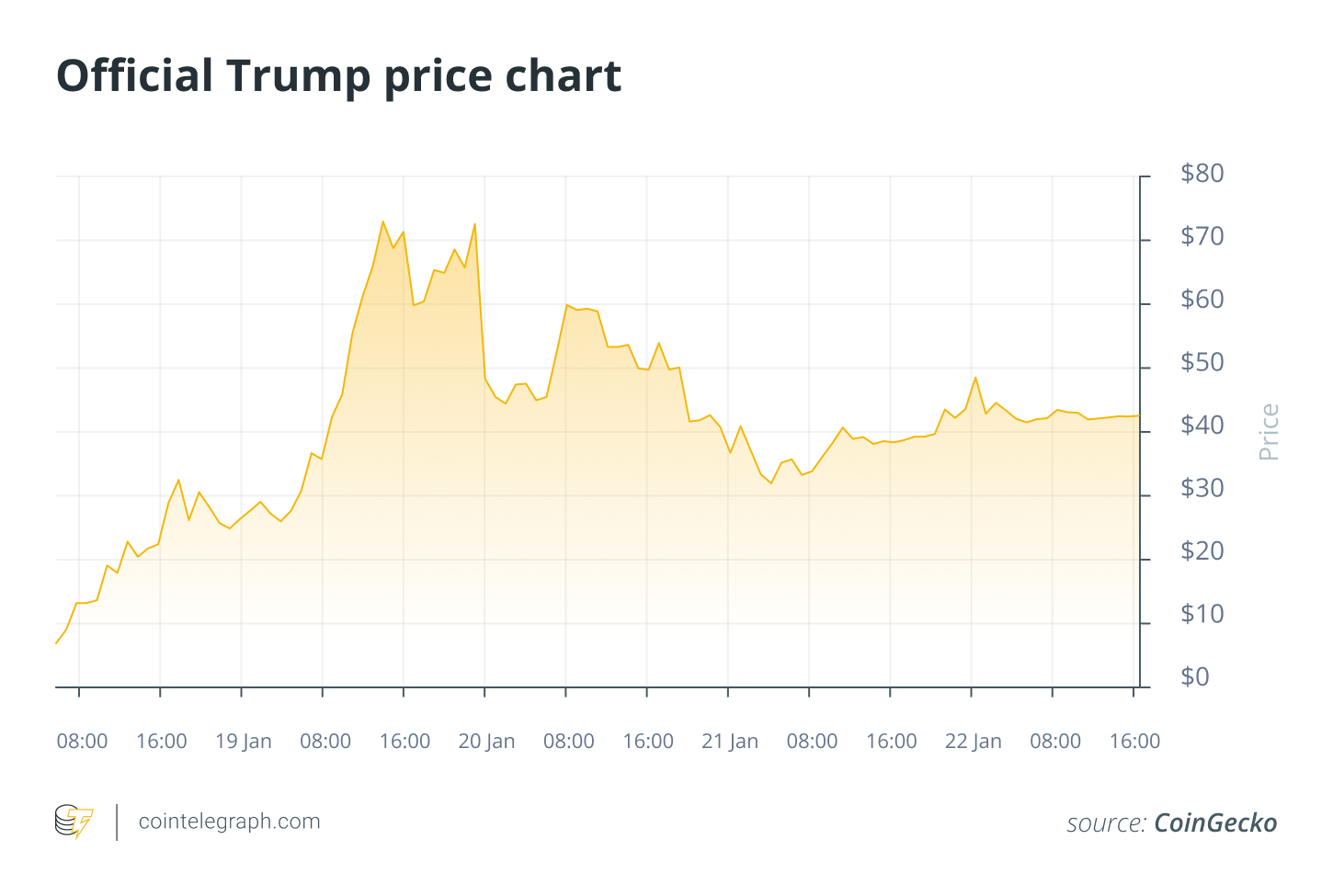 The president’s memecoin hit a peak of $72 on Jan. 19, then dipped to $44 on Jan. 20 when MELANIA launched. The coin briefly recovered while the president was sworn into office and has since hovered around the $40 mark. At the time of writing, the president’s memecoin is $37 — down 49% from its peak.