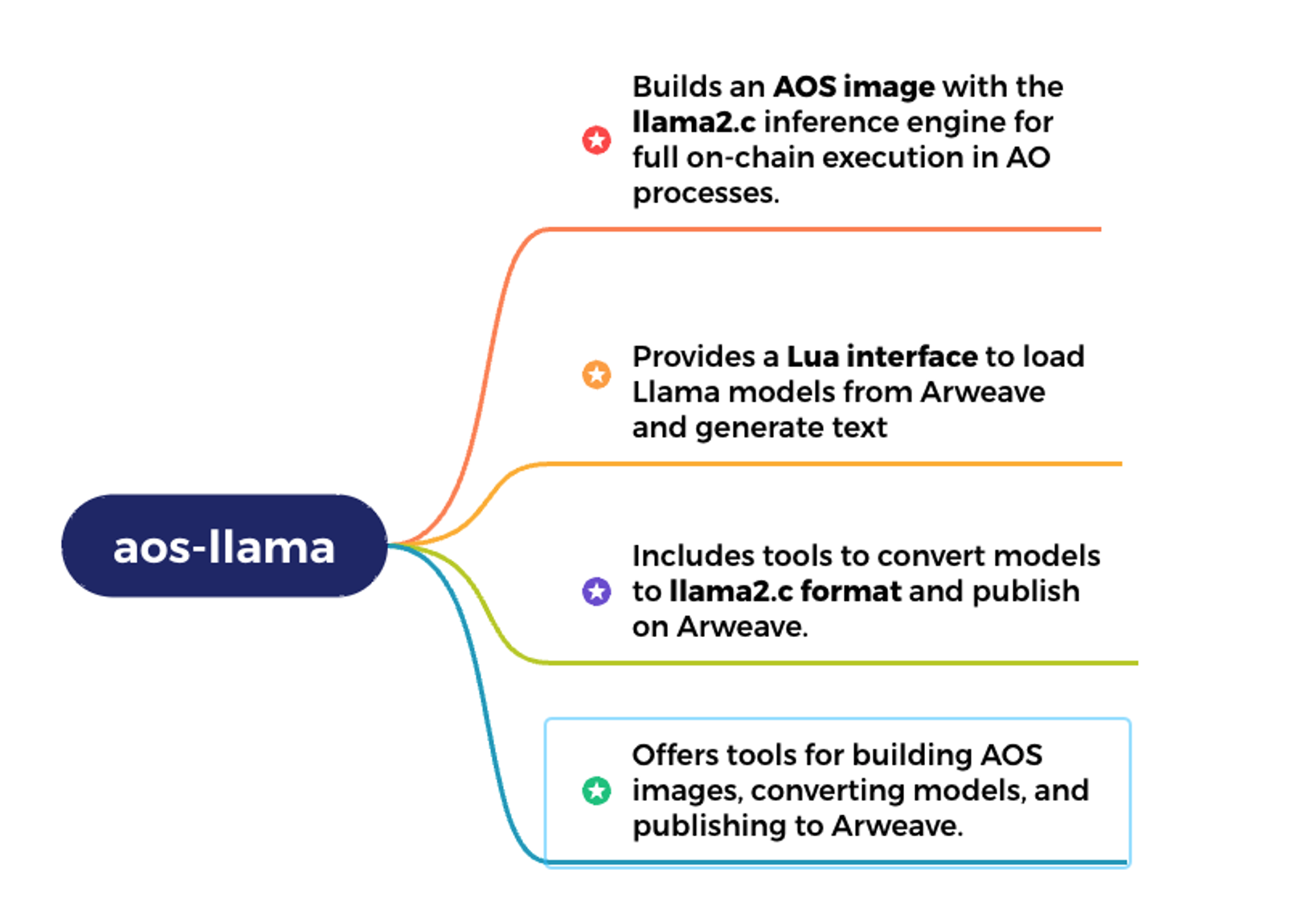- aos-llama uses the llama2.c inference engine to build an AOS image, enabling full on-chain execution in AO processes.