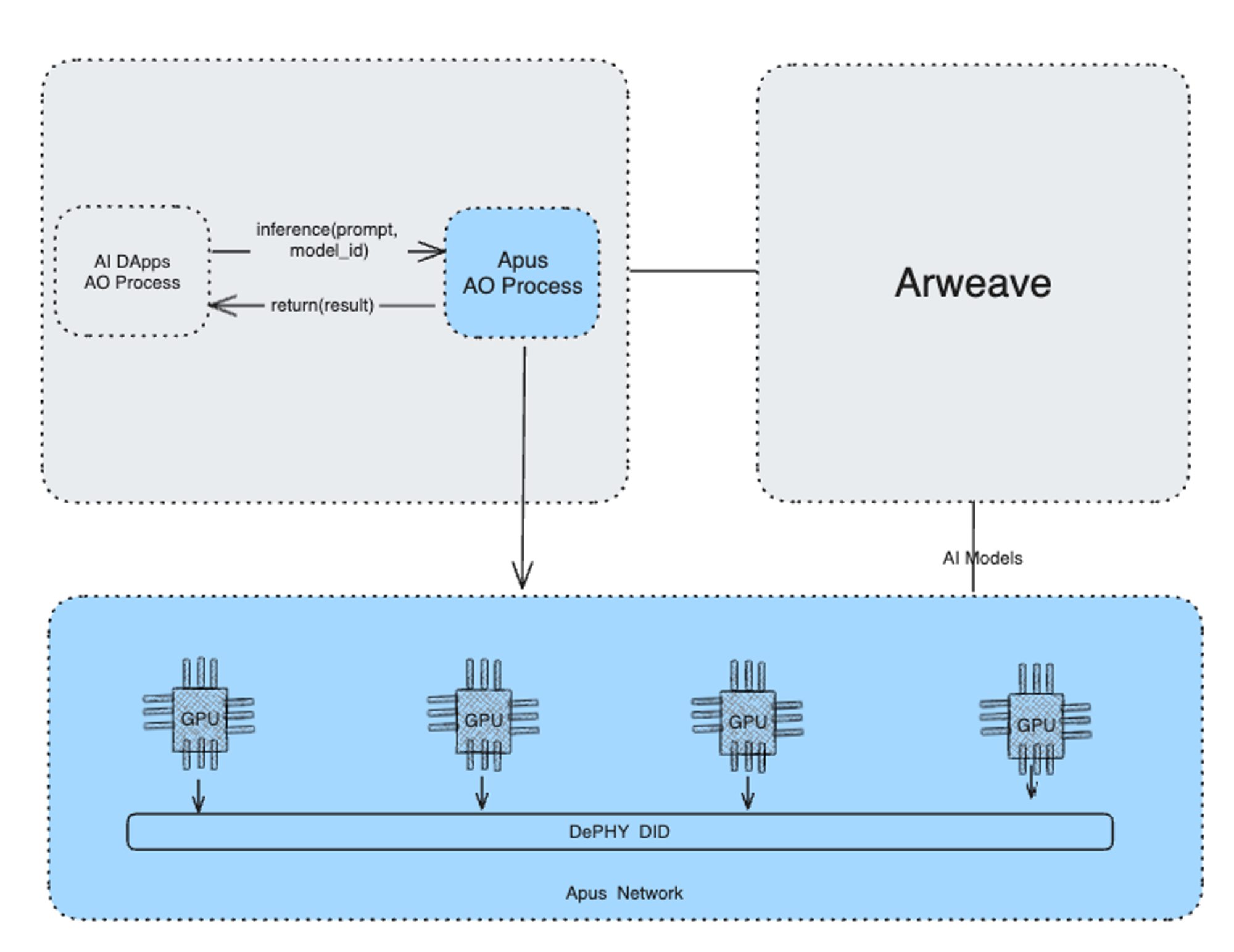 Leveraging AO’s Hyper Parallel Computer, Apus Network’s trustless GPU network is designed for secure, efficient, and scalable AI inference, providing necessary computing power for AI within Arweave while satisfying the three pillars of trustless AI: GPU integrity, AI model trustworthiness, and verifiable inference. The diagram provides a visual overview of the key components and their interactions.