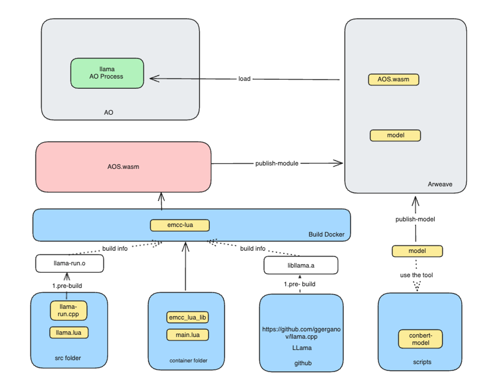 - Arweave acts as a decentralized storage platform, storing AOS.wasm and model files.