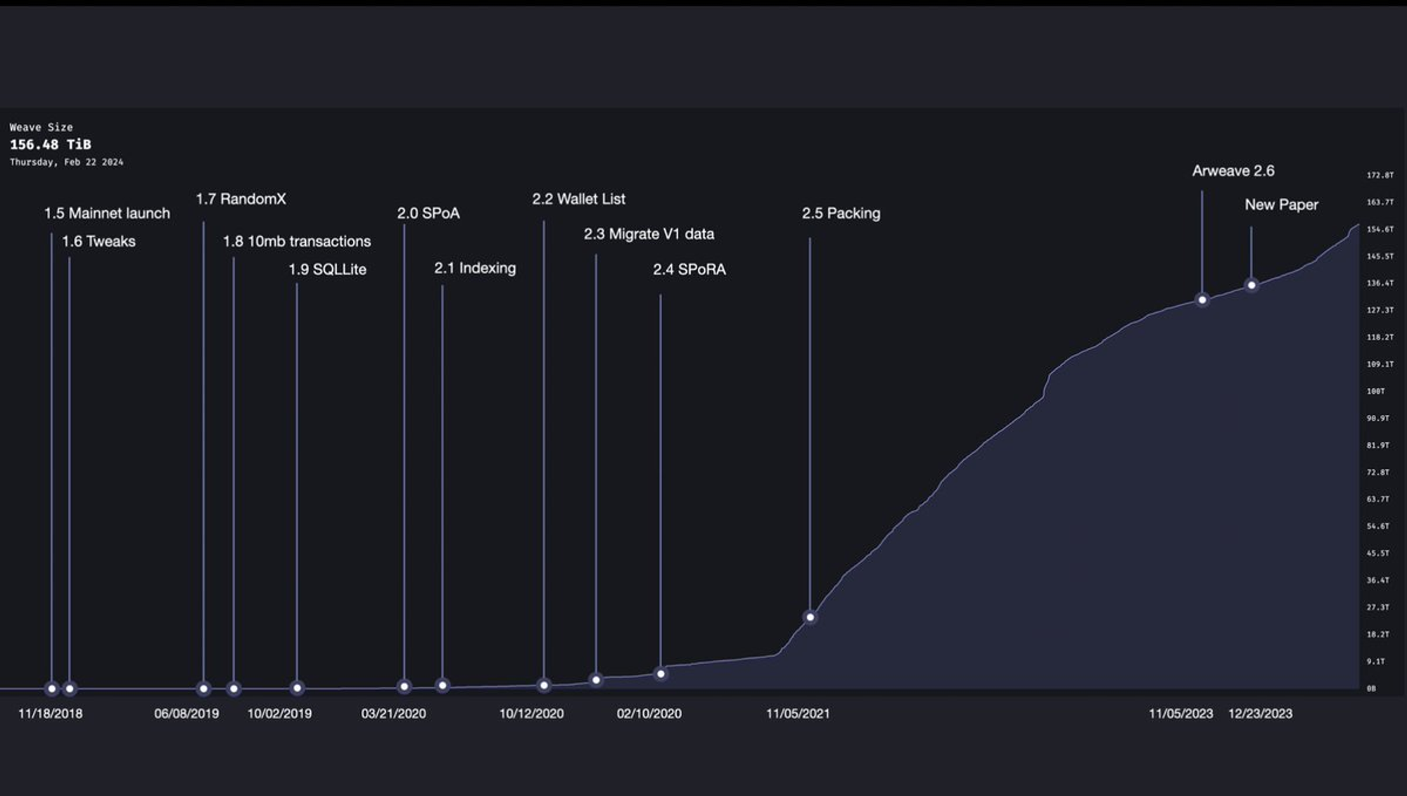 Figure 1: The curve graph depicting the size variation and version iterations of the Arweave Network over the past 6 years.