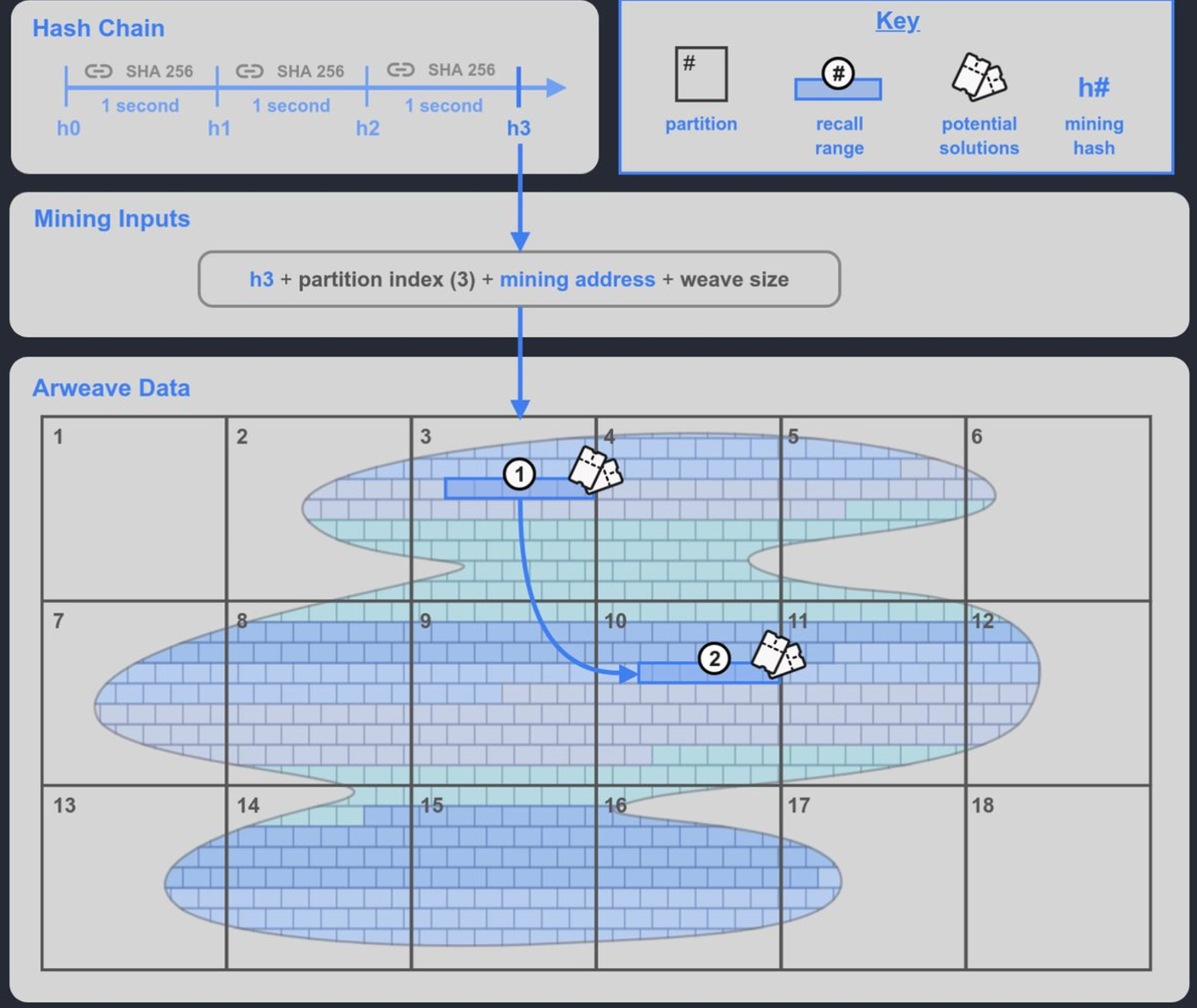 - Combining this Mining Hash with the partition index, a recall range is generated within the selected stored data partition of the miner, consisting of 400 recall blocks available for mining. In addition to this recall range, another recall range 2 is randomly generated in the Weave. If miners store enough data partitions, they can obtain range 2, providing an additional opportunity to mine with another 400 recall blocks, thereby increasing the chances of winning. This effectively incentivizes miners to store copies of enough data partitions.