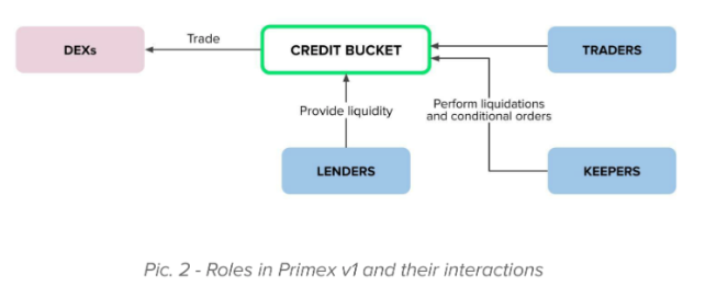 Primex is building a marketplace where lenders and borrowers can interact. Primex liquidity pools (called credit buckets) offer different parameters and associated risks and rewards for lenders than traditional DEXs or lending protocols. There are different pools for different assets, so lenders can choose to allocate to pools that meet their risk tolerance. Traders are the typical borrowers, and they can access that liquidity by choosing an asset to borrow and a credit bucket that matches their needs.