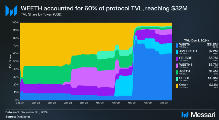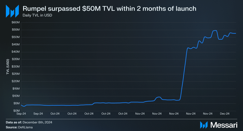 Rumpel has seen rapid growth since its launch in September 2024. The application debuted with liquid point strategies from Ethena, Symbiotic, Zircuit, and Karak. These strategies included locking USDe on Ethena, depositing Etherfi Wrapped eETH on Karak, and staking wstETH via Symbiotic. Between September and mid-November, Rumpel’s TVL grew to $7.5 million, eventually surpassing $50 million following the introduction of new Fluid looping strategies.