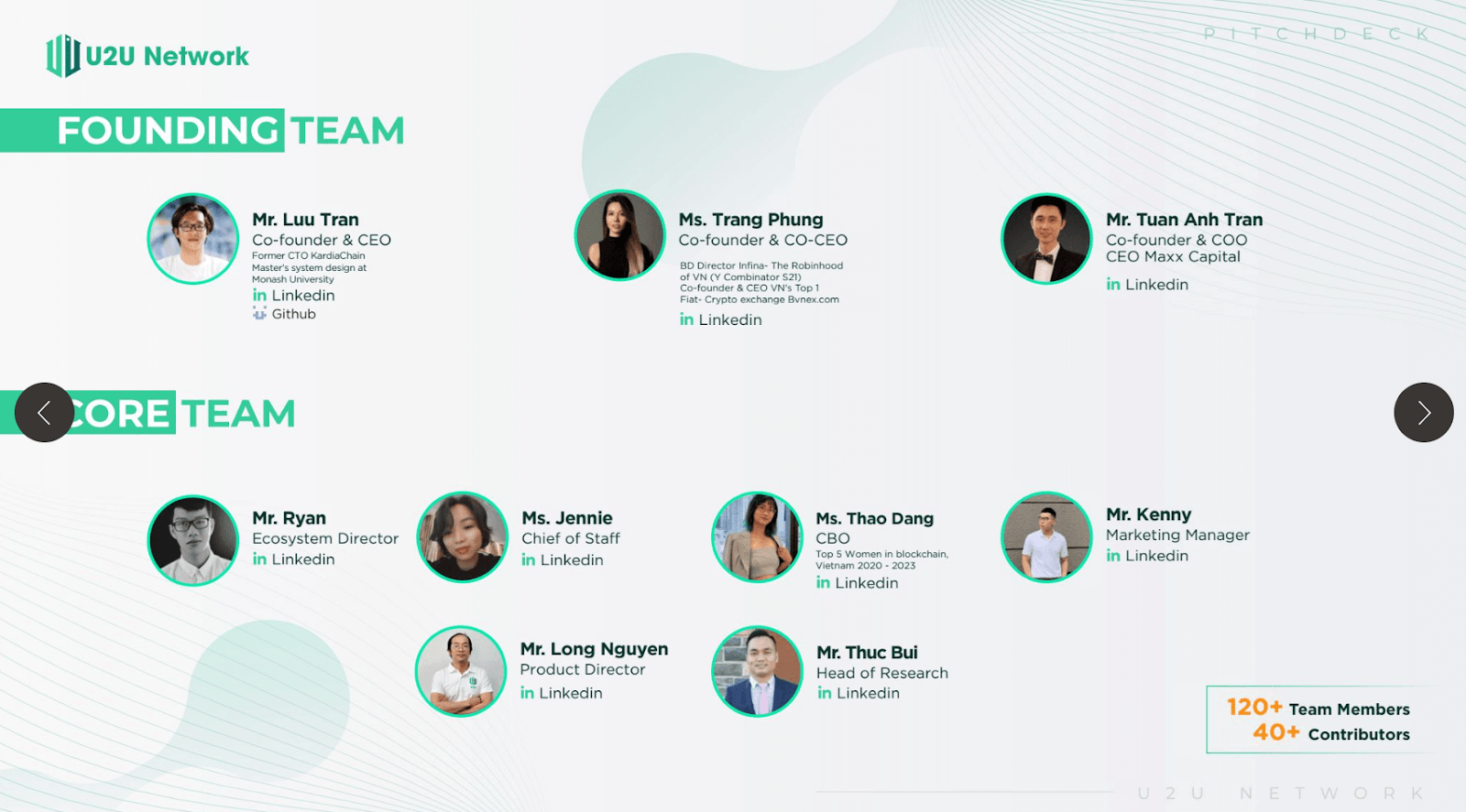 - Led by industry veterans such as Co-Founder & Co-CEO Luu Tran and Chloe Phung, U2U Network's leadership team has experience in blockchain technology and business development.