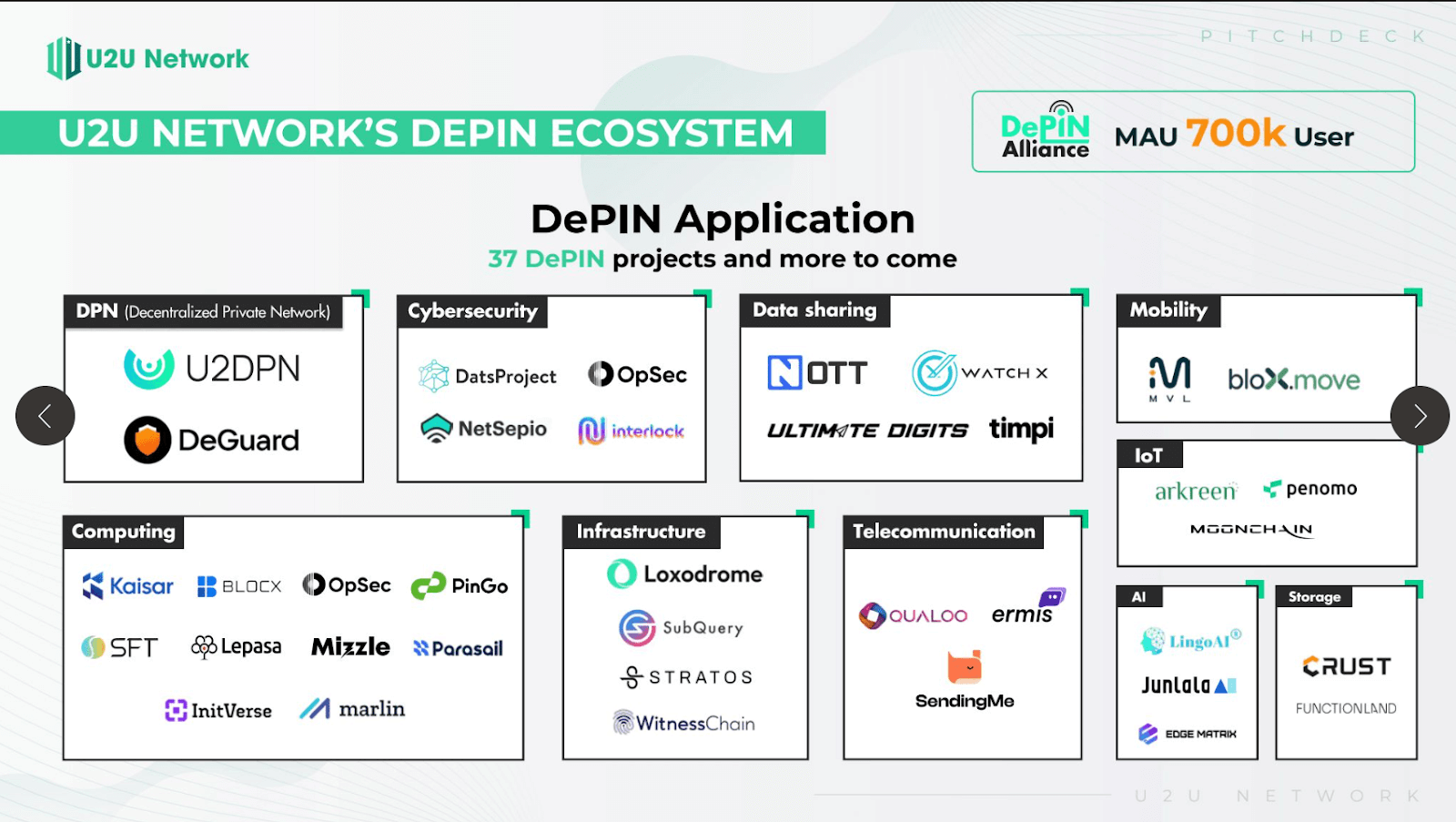 - With nearly 100 applications and a user base exceeding 1 million, combined with developer tools and initiatives like the DePIN Alliance, U2U Network fosters a dynamic and expanding ecosystem.