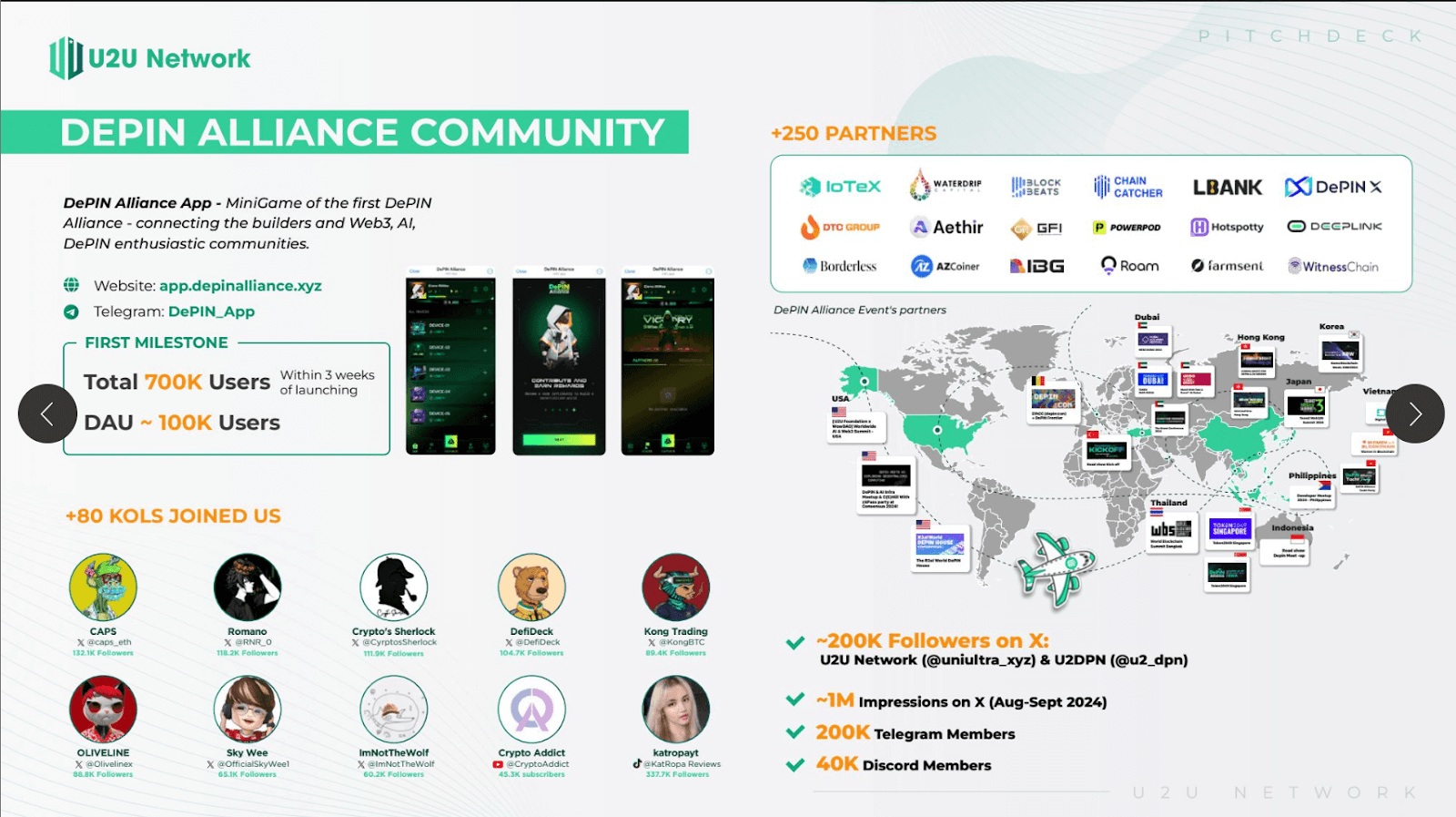 The U2U Network ecosystem has grown substantially, now supporting nearly 100 applications, with more than half focused on DePIN. U2U has also attracted a significant user base, exceeding 1 million users, with over 100,000 daily active users. The global community spans key markets, including Japan, Korea, Turkey, and Russia. Strategic partnerships with major industry players further strengthen U2U's position in the market.
