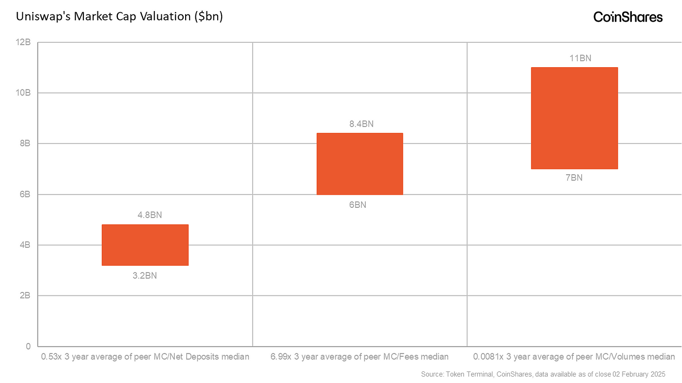 At a current market capitalisation of approximately $5.98 billion (with BTC at ~$98.9K), UNI exhibits an estimated 40% upside based on the three-year average Market Cap/Fee median of peers, implying a valuation of $8.4 billion. Additionally, based on the three-year average Market Cap/Trading Volume median of peers, the potential upside extends to 84%. These ratios are more growth ratios, and probably useful when analysing liquid tokens in crypto.