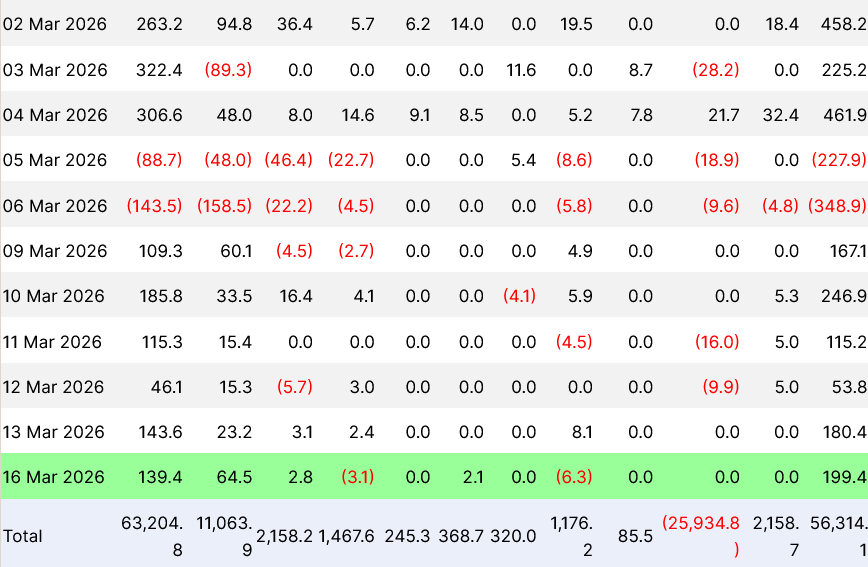 Flow data for the US spot Bitcoin ETFs in March. Source: Farside Investors
