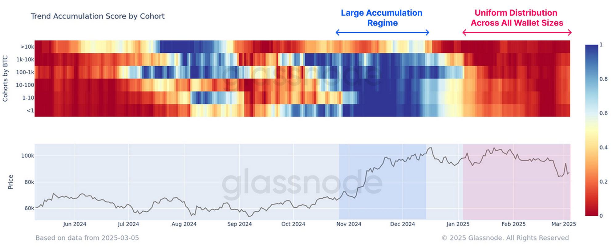 We can see a notable uniformity in the accumulation and distribution behavior across varying wallet sizes. Over the last two months, all wallet size cohorts have engaged in heavy distribution, providing enormous sell-side pressure to the market.