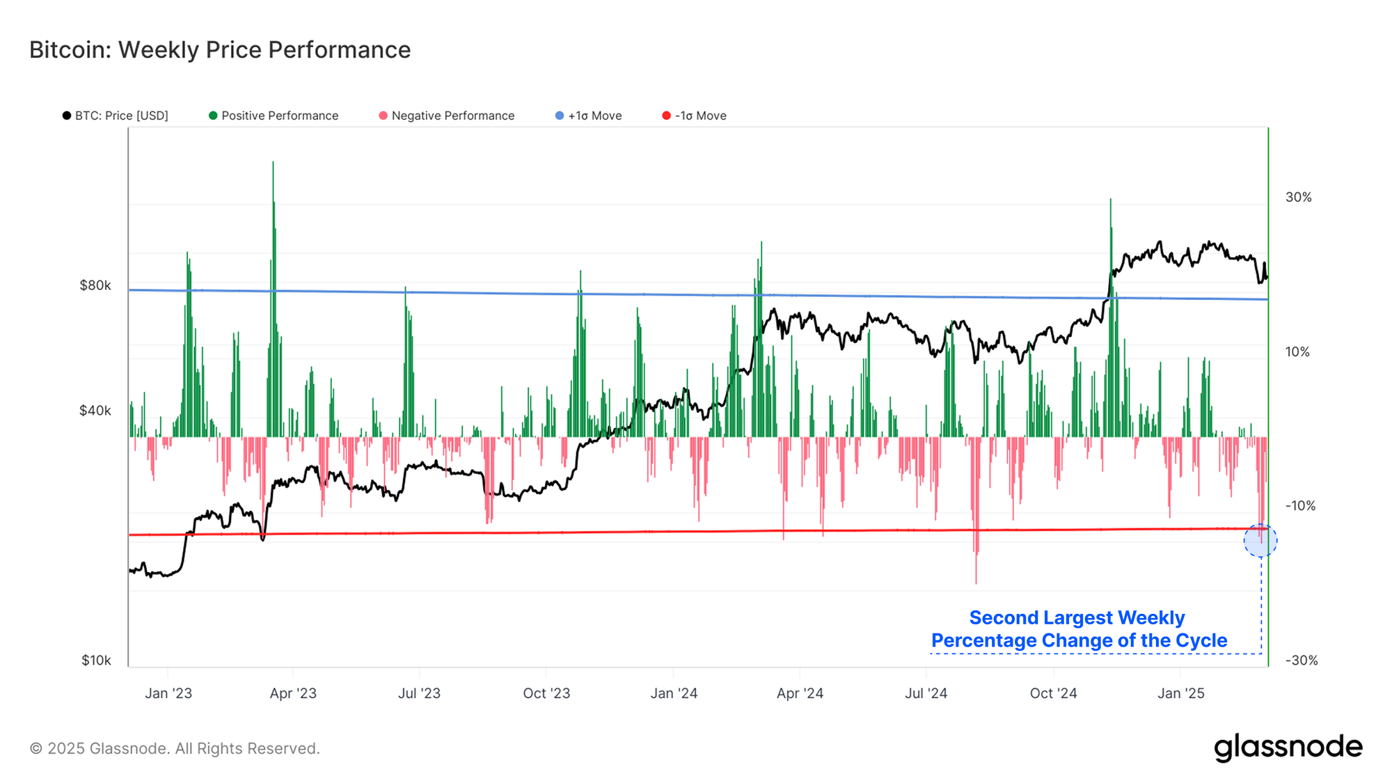 Despite Bitcoin holding up better relative to other major assets, the recent sell-off has still been the second largest weekly decline of this cycle. The market sold off -13.9% over the last week, bested only by the yen-carry-trade unwind event that occurred on 5-Aug-2024.
