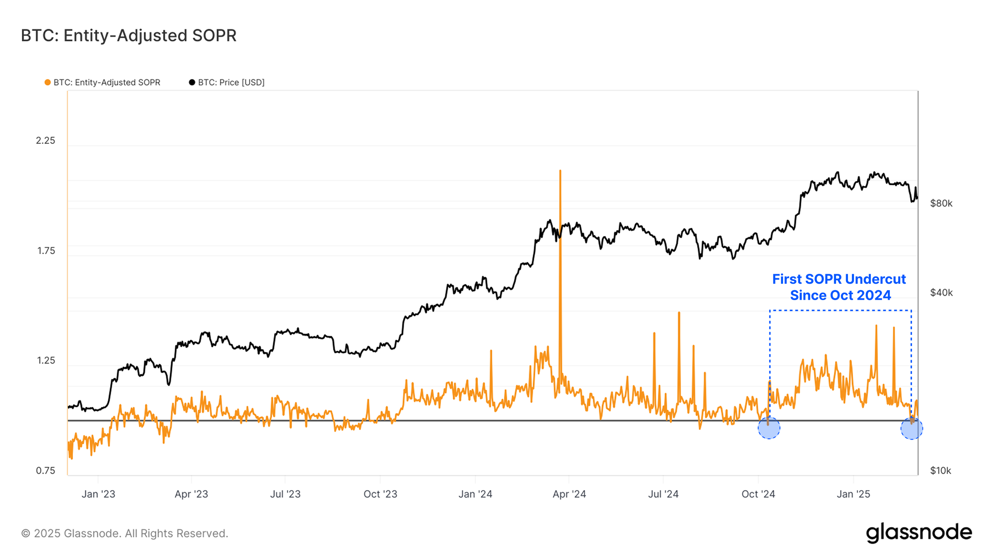 From the perspective of the SOPR metric, which assesses the average profit/loss multiple locked in across investors, we note the first period of loss dominance since Oct 2024.