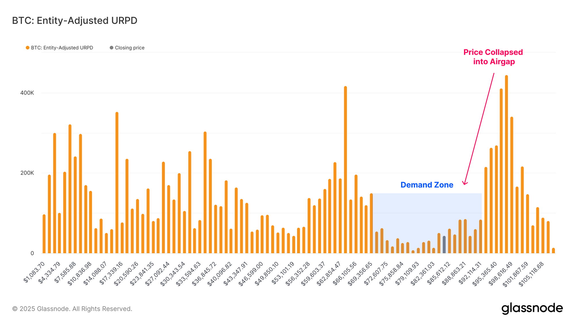 Notably, the initial collapse in prices took the market below $86k, a zone where very few coins had previously changed hands. In a way, the market is testing to see whether the bulls are willing to provide demand support in this area, especially since so many coins have been acquired at prices above $90k, and are now holding an unrealized loss.