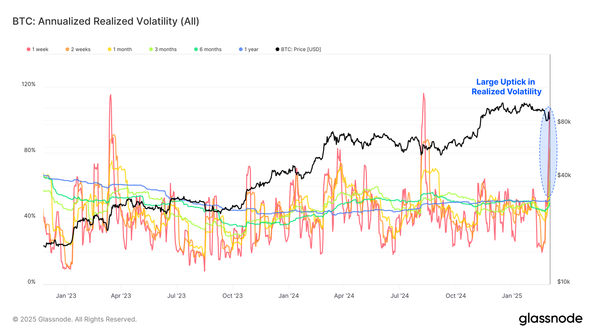 We can see that realized volatility for Bitcoin surged across several time frames. From this perspective, the 1-week and 2-week rolling windows have recorded some of the highest volatility values of the cycle so far, exceeding 80%.