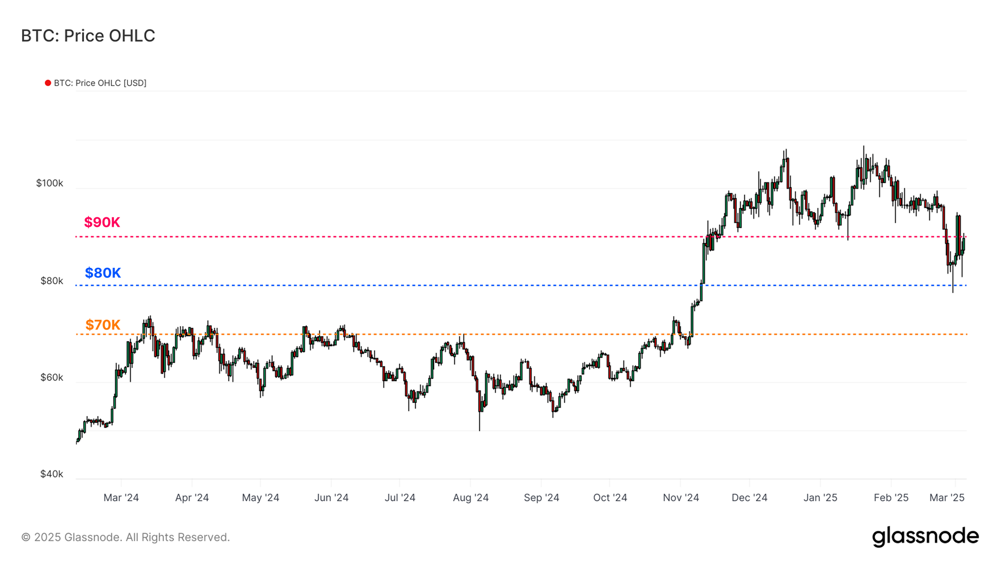Between Feb 26th to March 3rd, over 150k coins (0.76% of the circulating supply, and equivalent to $14.2B in value), were acquired within this ‘air-gap’ region below $86k.