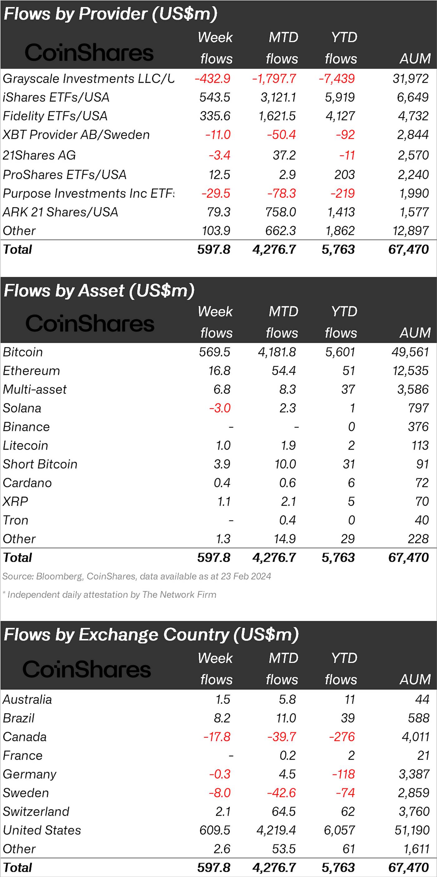 - The US saw most of the inflows at US$610m, impacted by incumbent issuer Grayscale, which saw further outflows totalling US$436m last week.