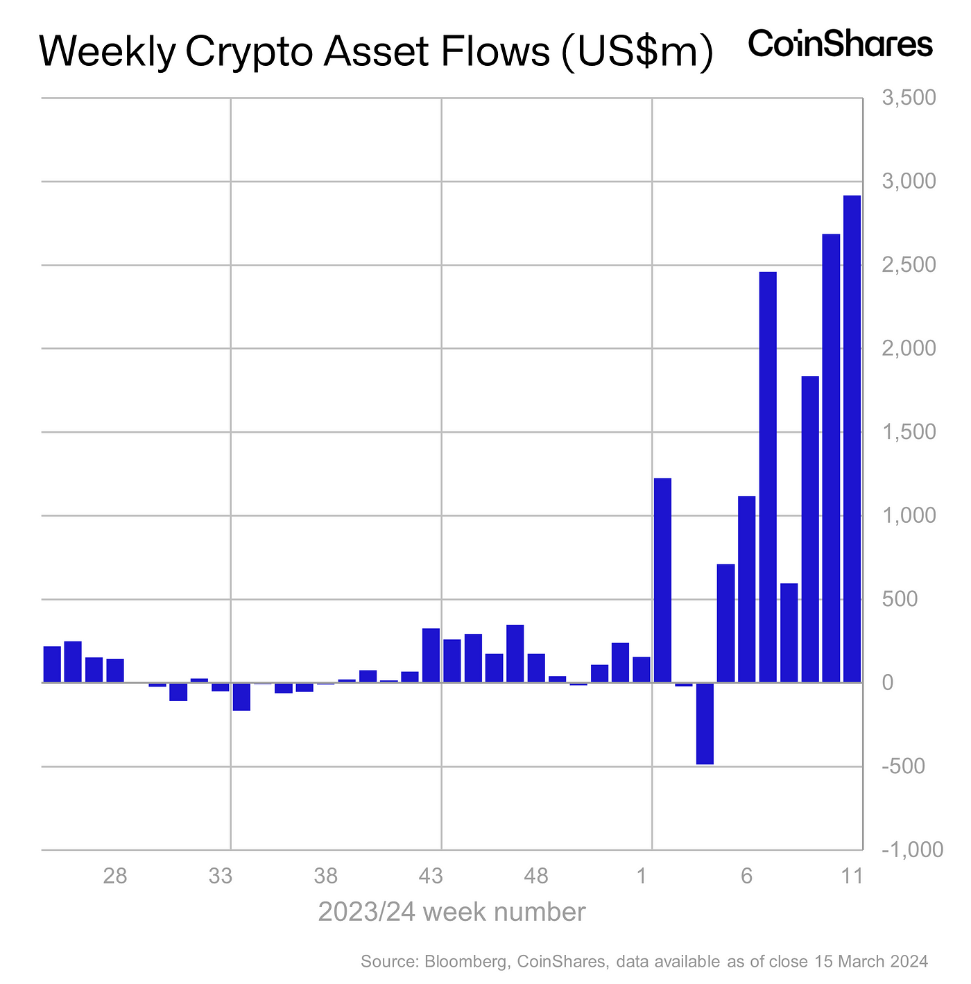 - Digital asset investment products saw record weekly inflows totalling US$2.9bn, beating the prior week’s all-time record of US$2.7bn.