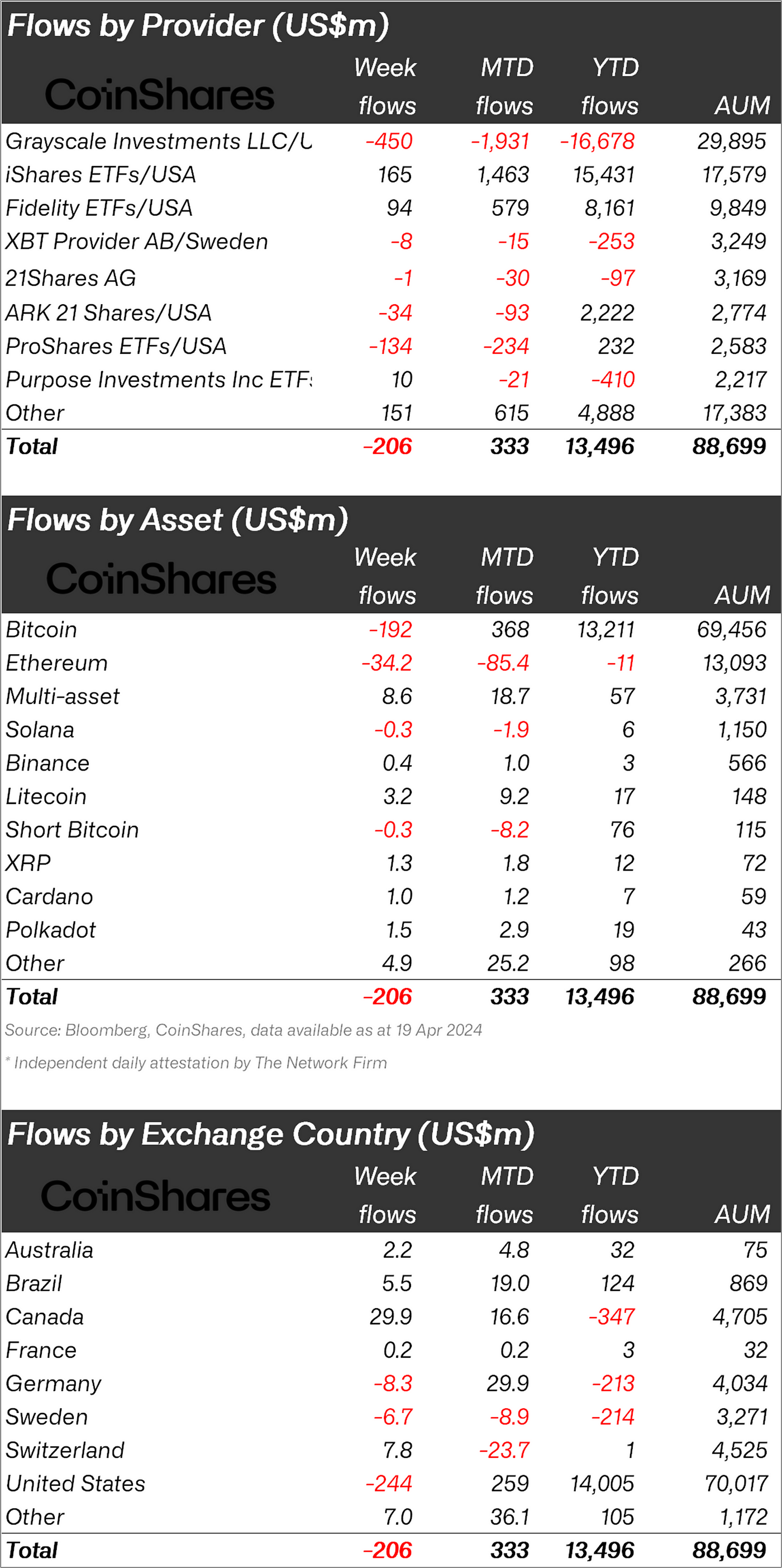- Bitcoin saw US$192m outflows, but few investors saw this as an opportunity to short, with short-bitcoin seeing US$0.3m outflows.