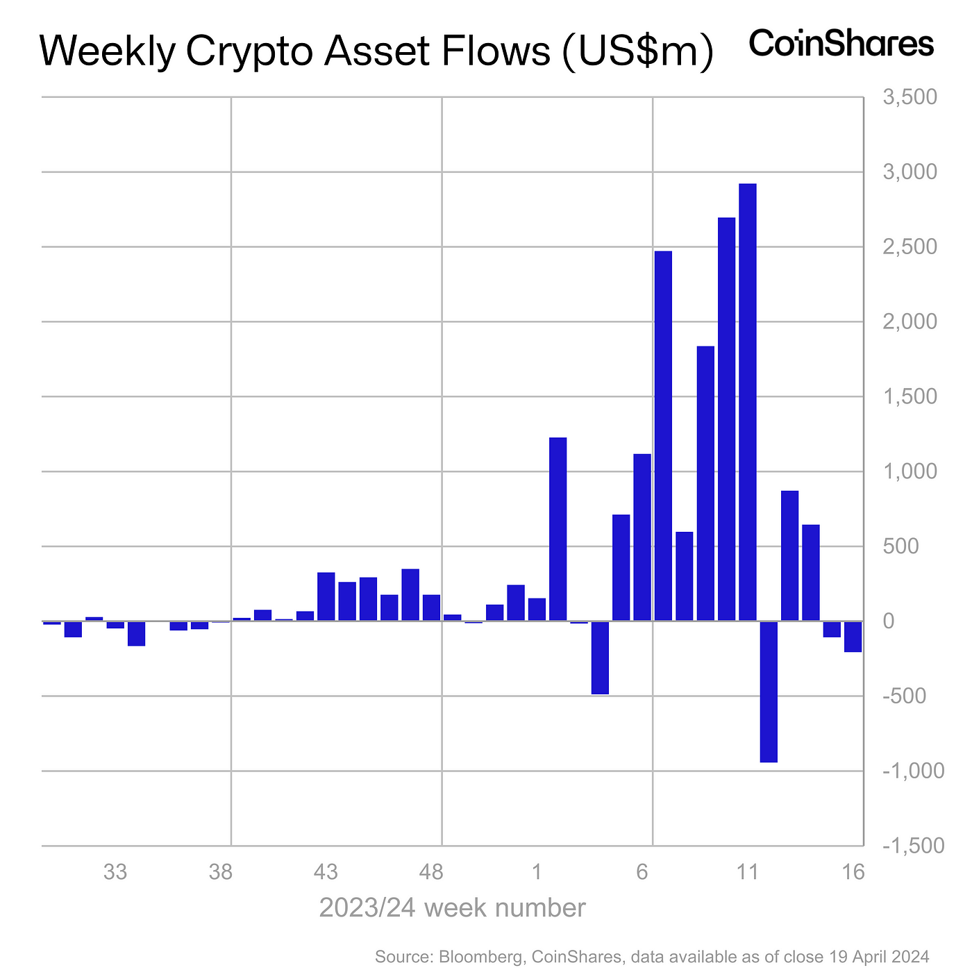 - Blockchain equities saw its 11th consecutive week of outflows totalling US$9m as investors continue to worry over the consequences of the halving on mining companies.