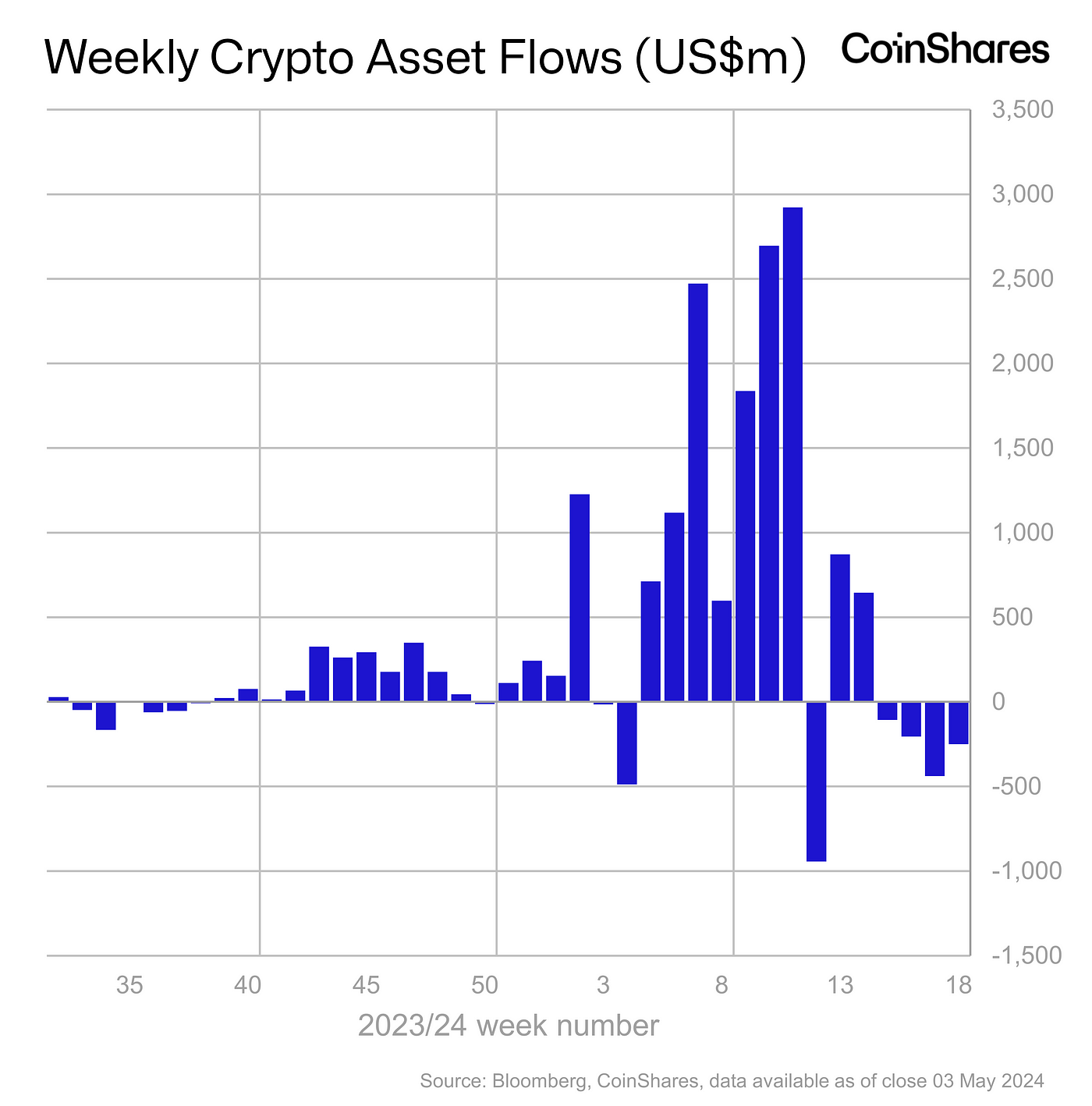 - Digital asset investment products saw outflows for the fourth consecutive week totalling US$251m. This week marked the first week to see any measurable outflows from the newly issued ETFs in the US.