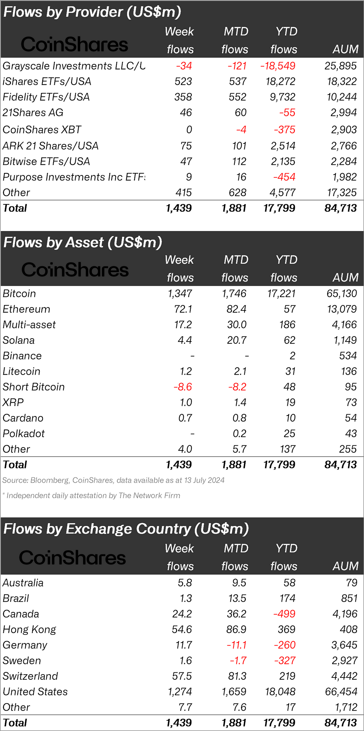 - Ethereum, which saw US$72m inflows last week, likely in anticipation of the imminent approval of the spot-based ETF in the US.