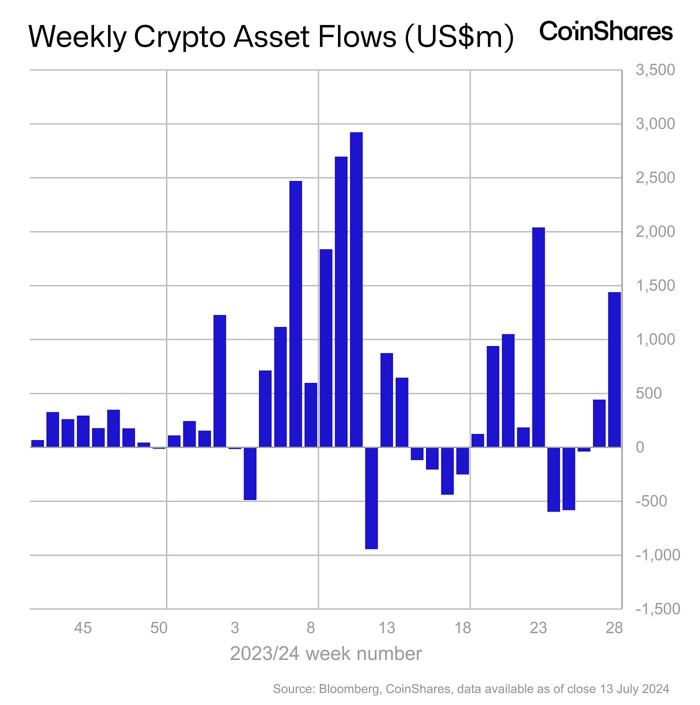 - Bitcoin saw the 5th largest weekly inflows on record with US$1.35bn, while short-bitcoin saw the largest weekly outflows since April at US$8.6m.
