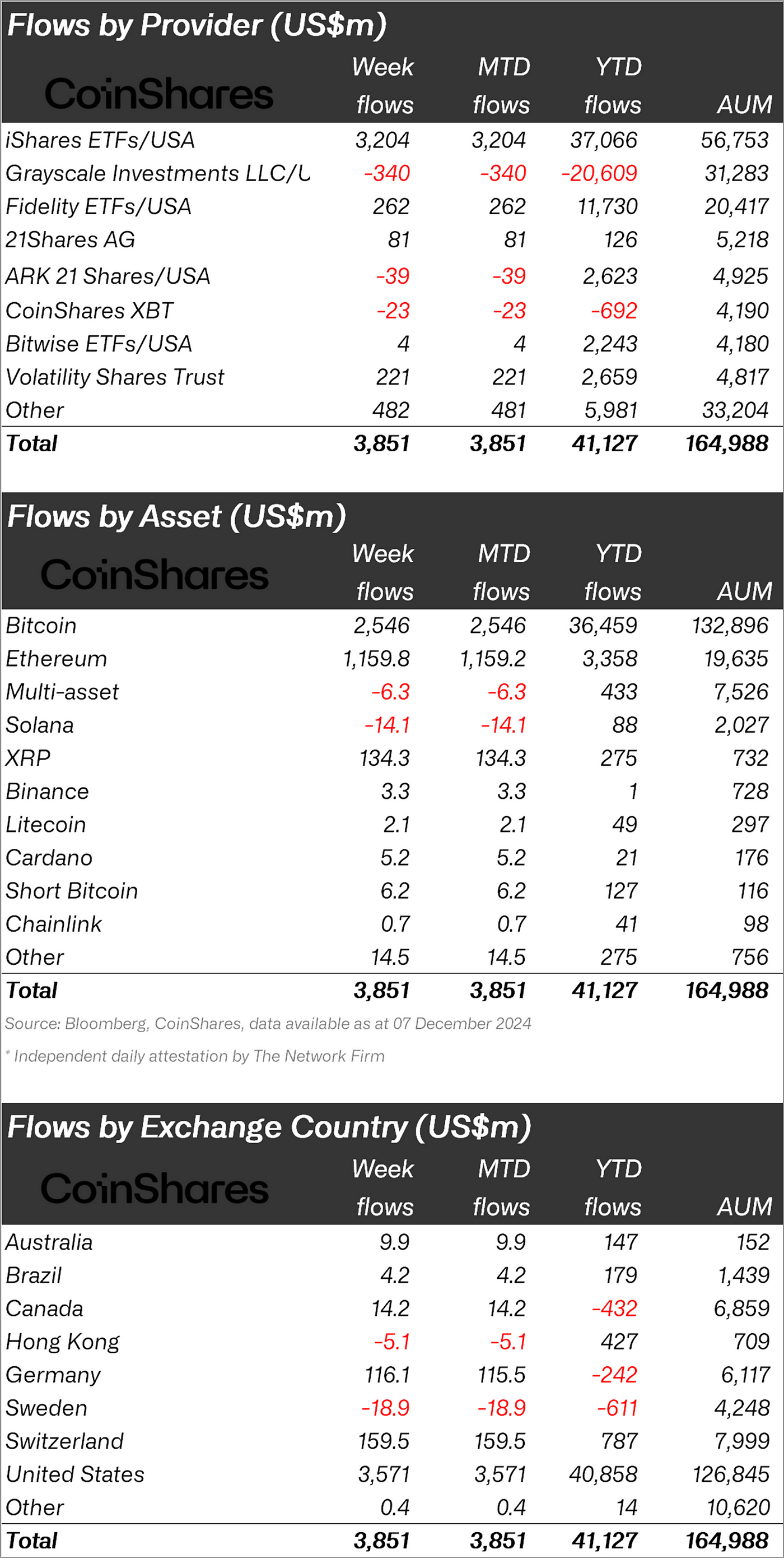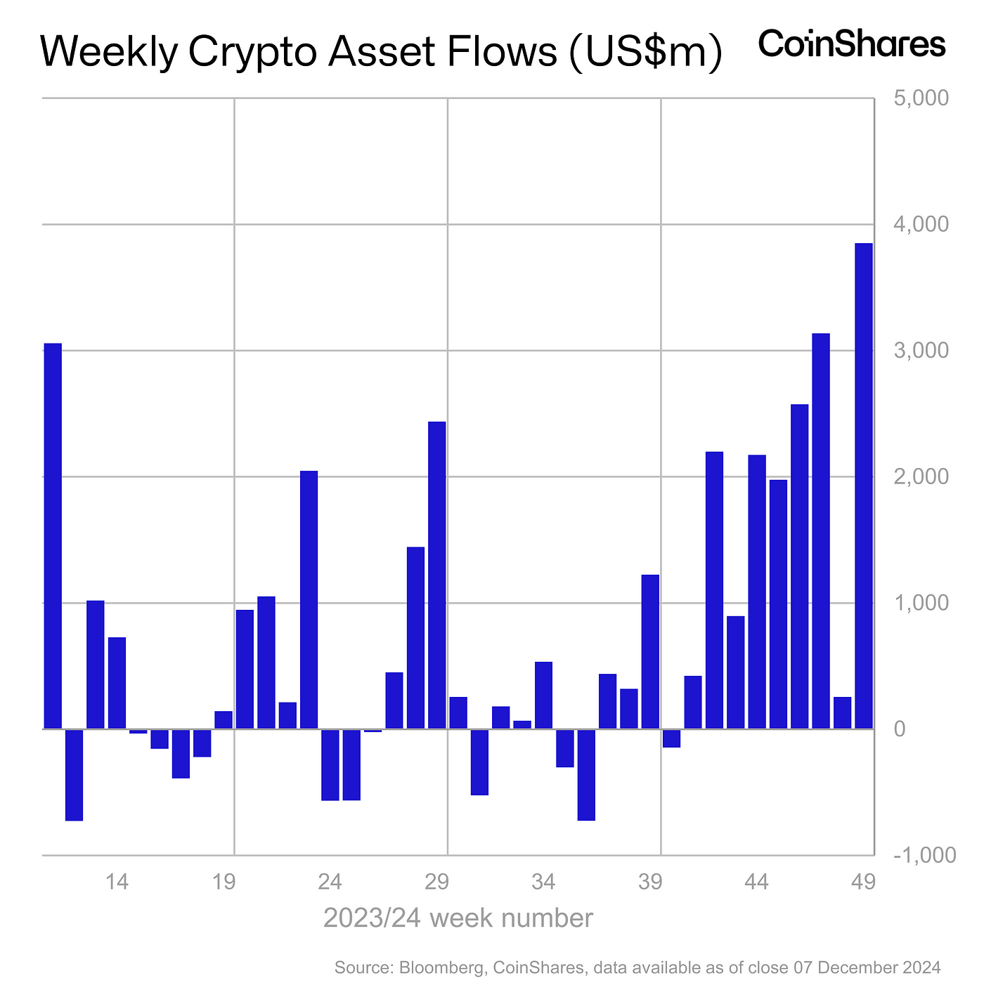 Largest weekly inflows on record of US$3.85bn with ETH seeing record inflows