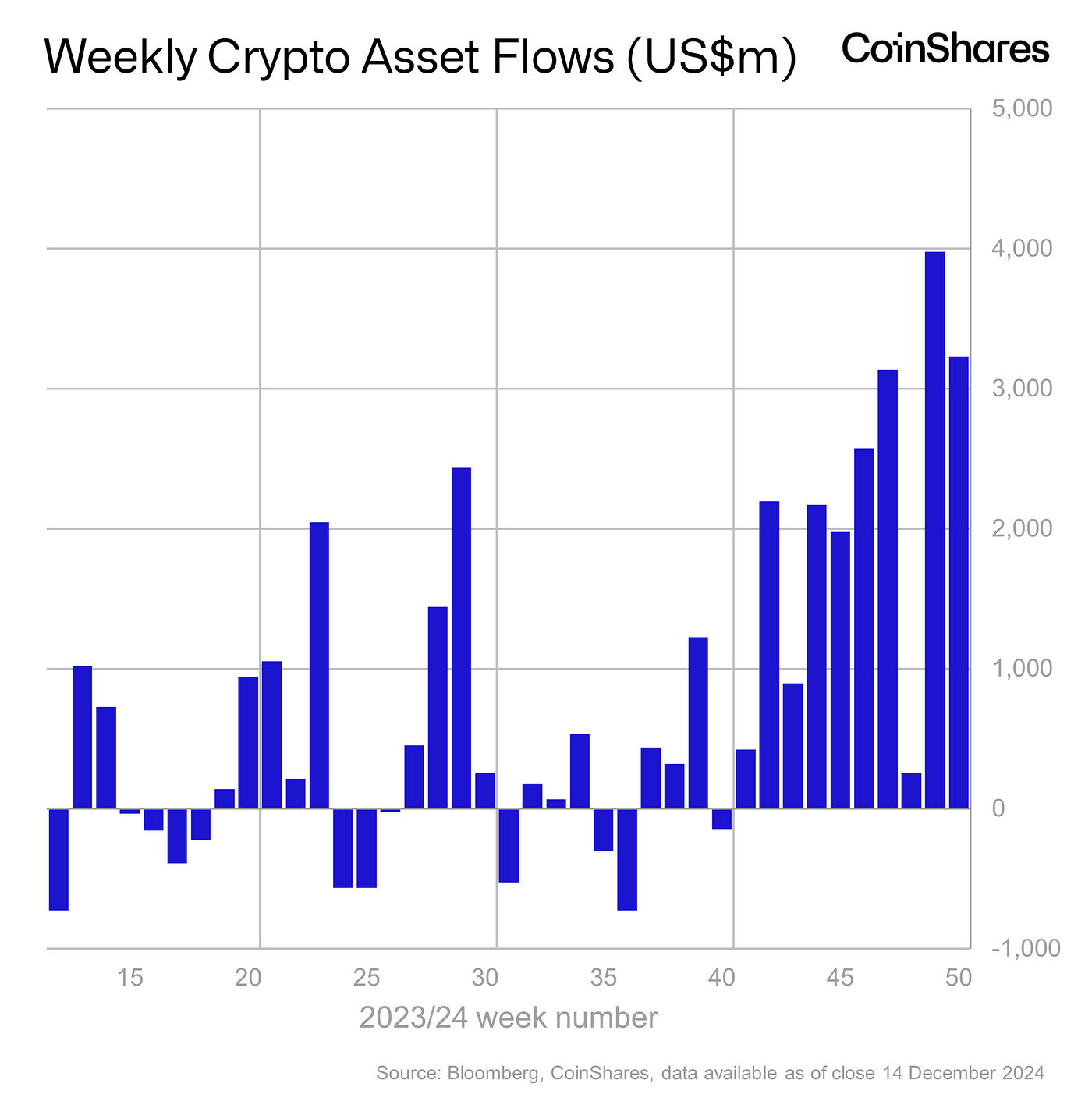 - Bitcoin investment products saw inflows totalling US$2bn, bringing total inflows since the US election to US$11.5bn.