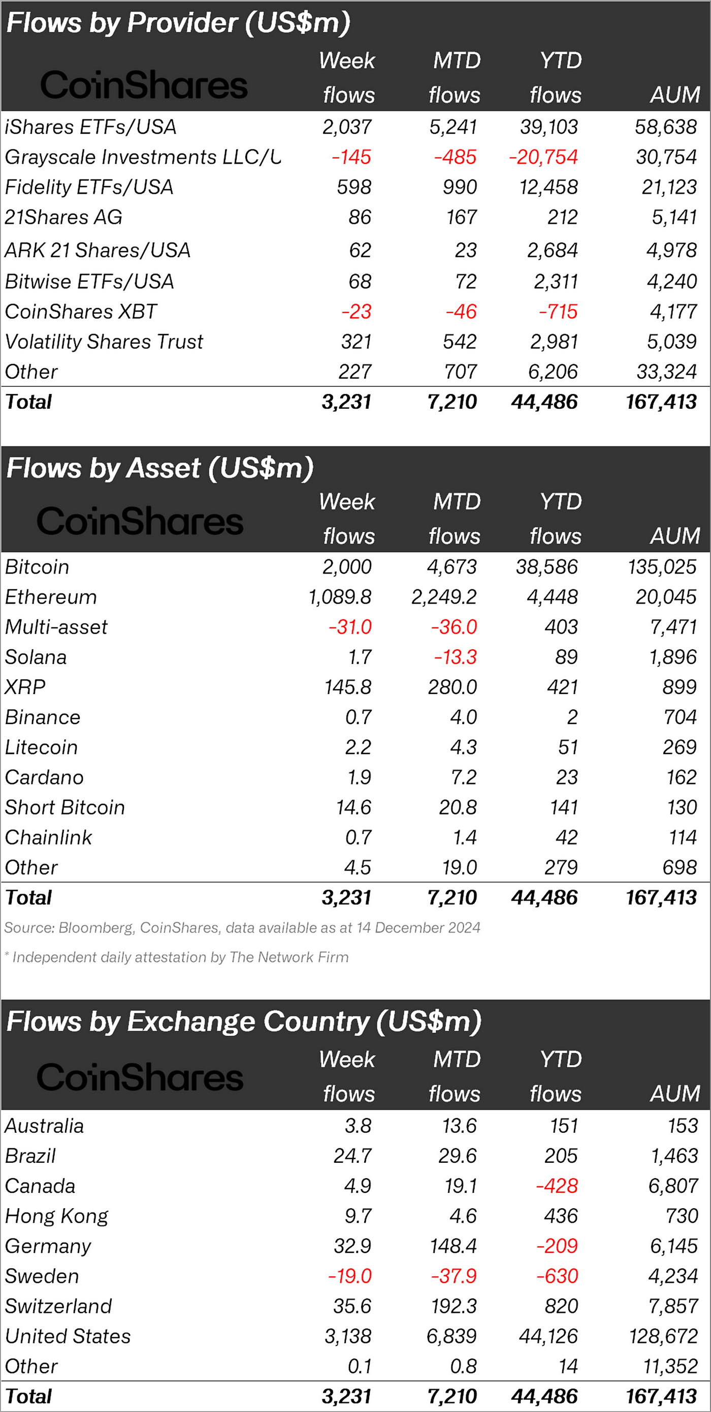 - Ethereum saw its 7th consecutive week of inflows of US$1bn, with inflows over those 7 weeks totalling US$3.7bn.
