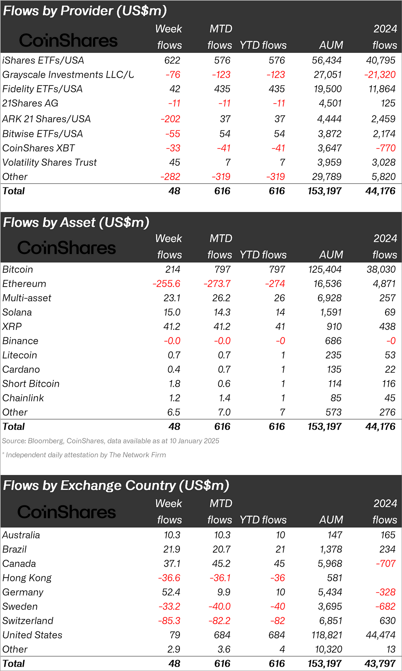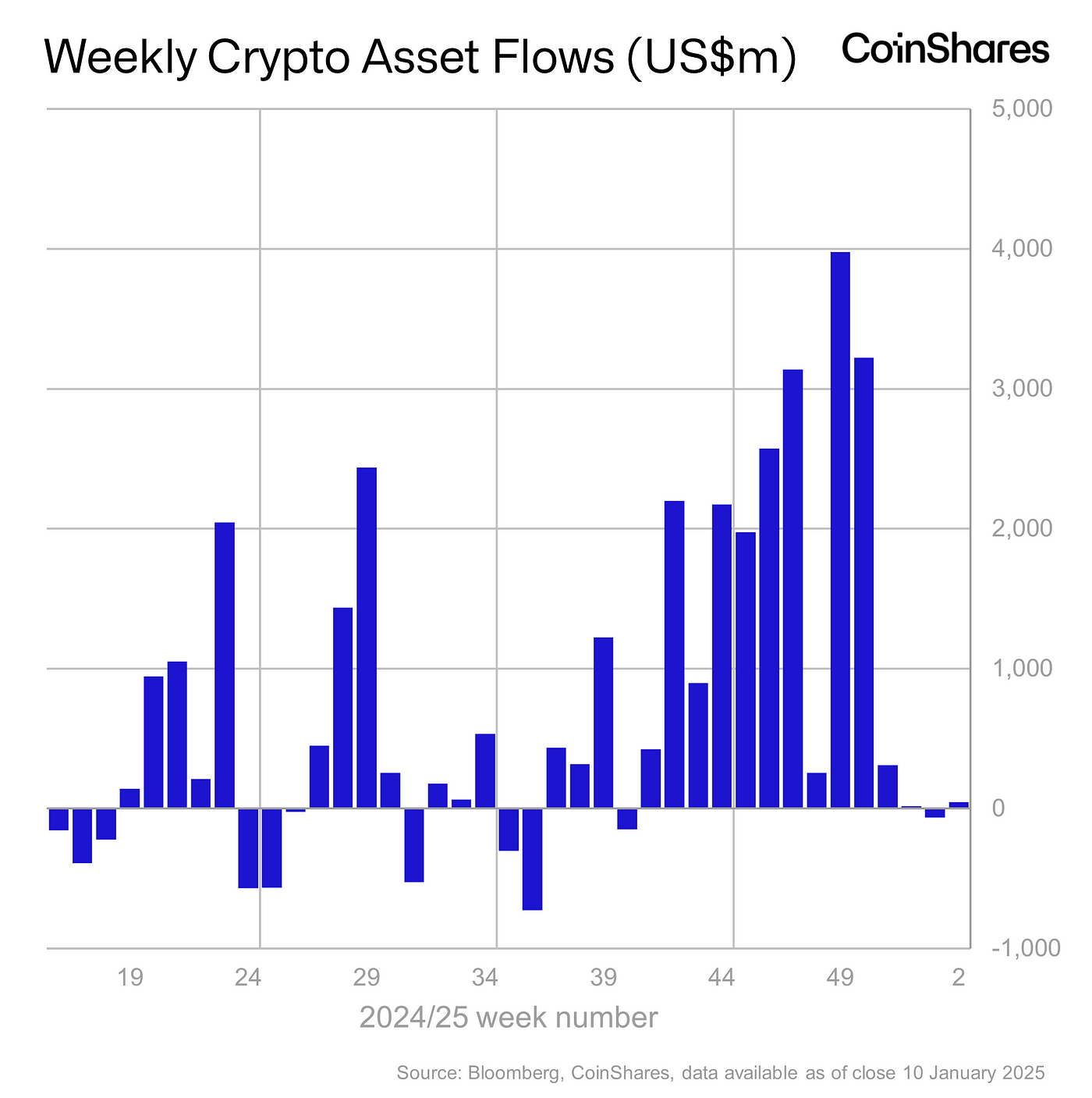 Digital asset investment products recorded modest inflows of US$48m last week. Although nearly US$1 billion poured in during the first half of the week, the release of new macroeconomic data and the US Federal Reserve’s minutes — which pointed to a stronger US economy and a more hawkish Fed — led to outflows of US$940 million in the latter half. This suggests that the post-US election honeymoon is over, and macroeconomic data is once again a key driver of asset prices.