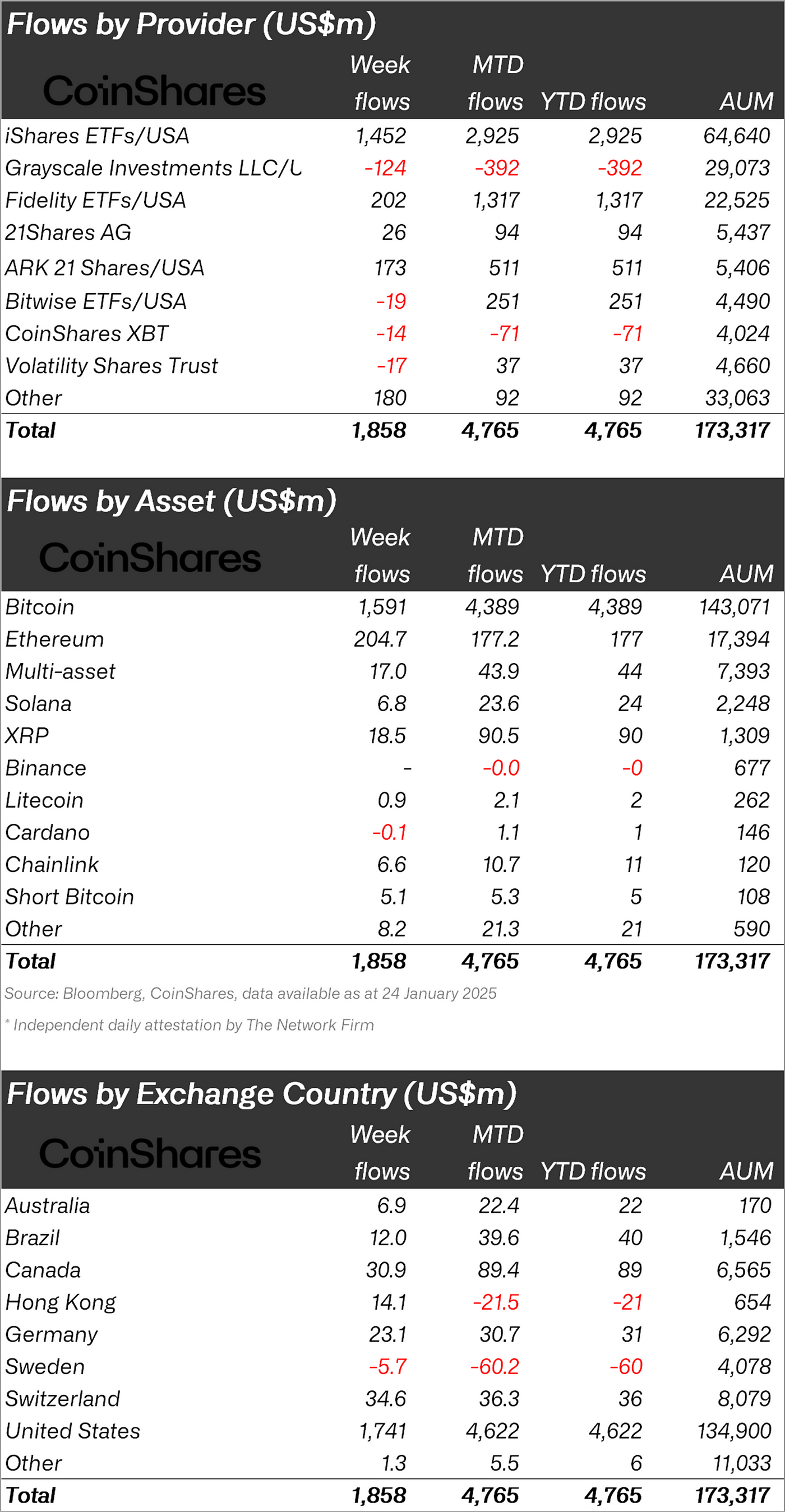 Bitcoin saw inflows totalling US$1.6bn, bringing YTD inflows to US$4.4bn, accounting for 92% of all inflows in the digital asset sector. Following Bitcoin’s pre-inauguration new all-time highs last week, it was no surprise to see short-Bitcoin ETFs regain traction, with inflows of US$5.1 million.