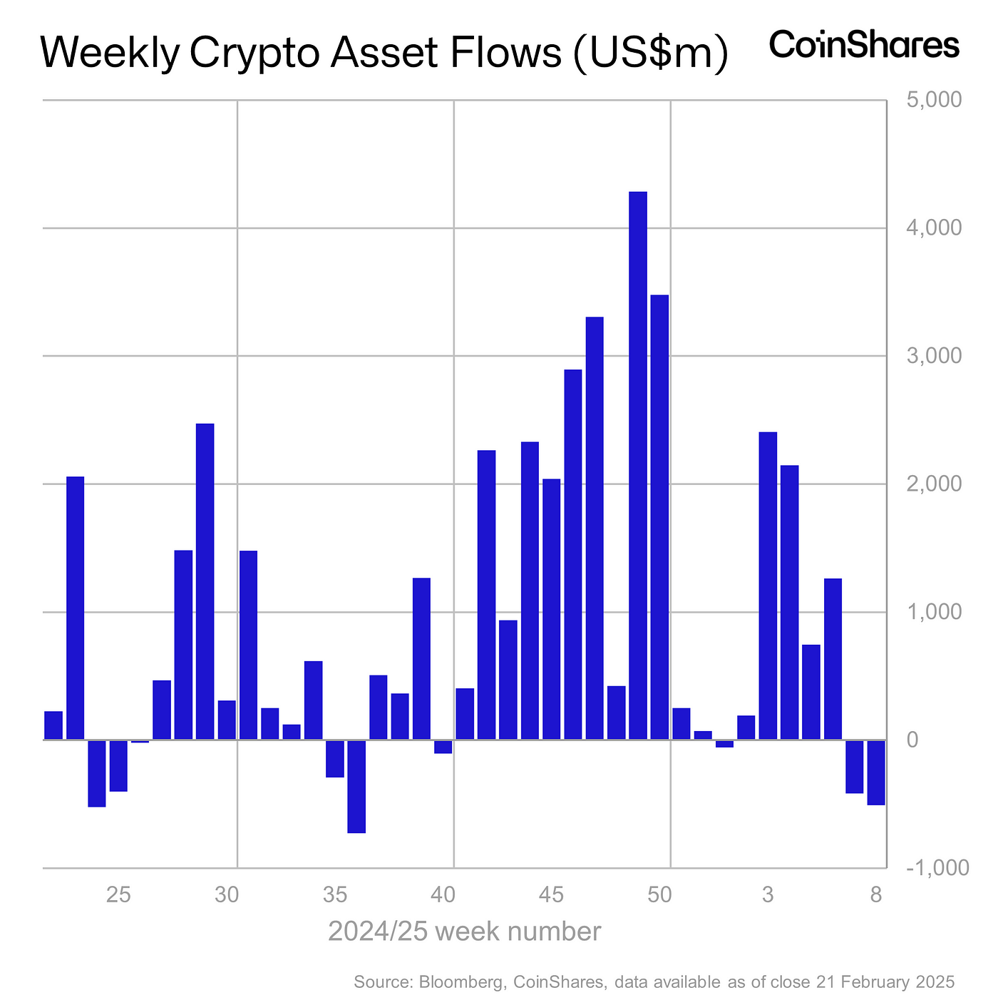 - Digital asset investment products saw outflows totalling US$508m as investors exercise caution following the US Presidential inauguration and the consequent uncertainty around trade tariffs, inflation and monetary policy