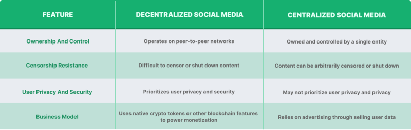 Decentralized control: Decentralized social media networks are maintained and governed by a decentralized network of users instead of a single entity or organization. This means that there is no central point of control or censorship, and users have greater control over their data and privacy.